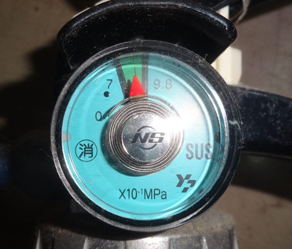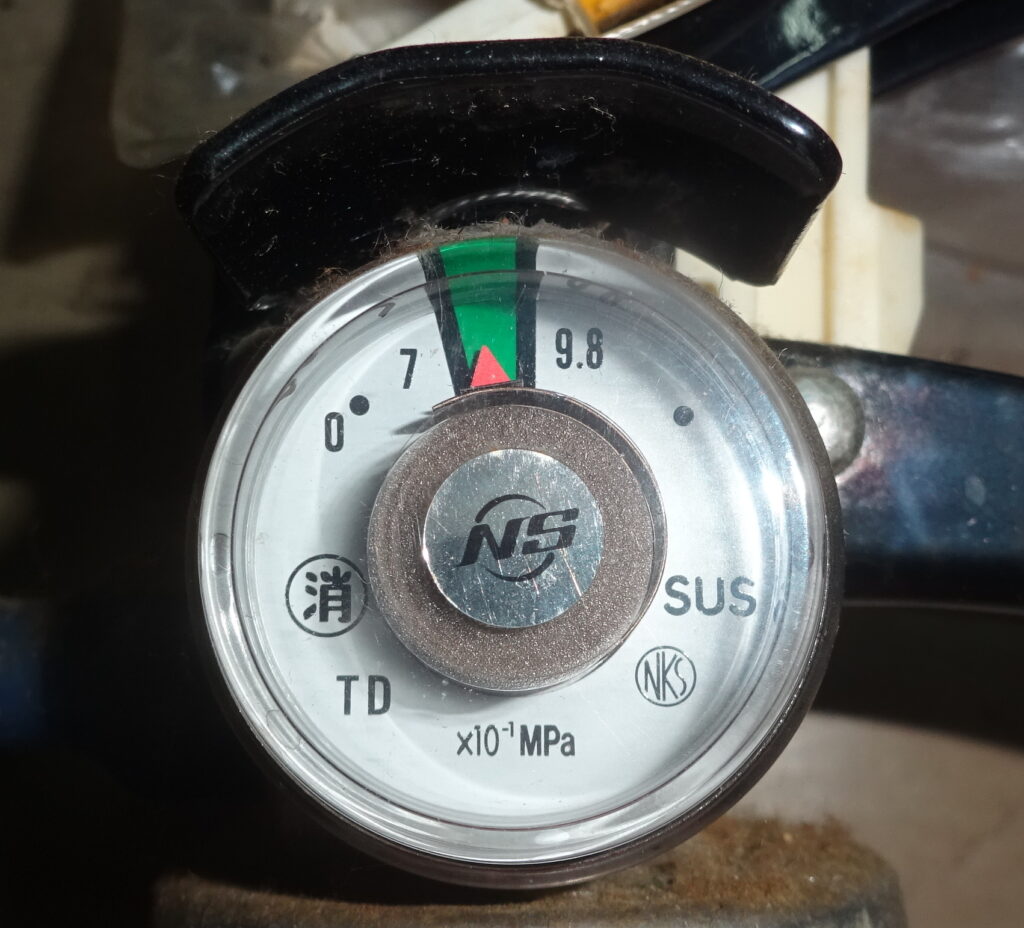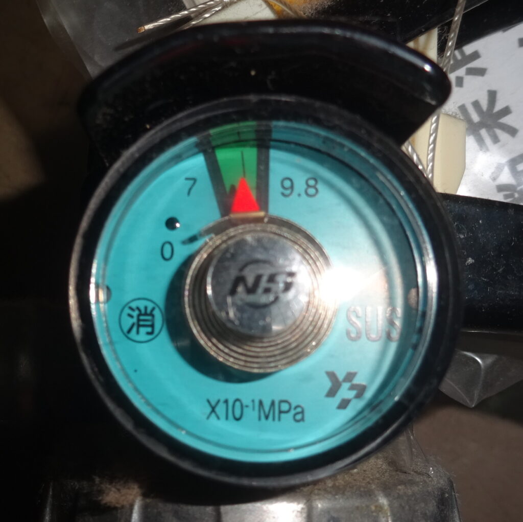 上の画像の 消火器の 指示圧力計の指針は 緑色範囲内(0.7MPa~0.98MPa[約7気圧~約9.8気圧])でありますので、まだ 使用可能であります