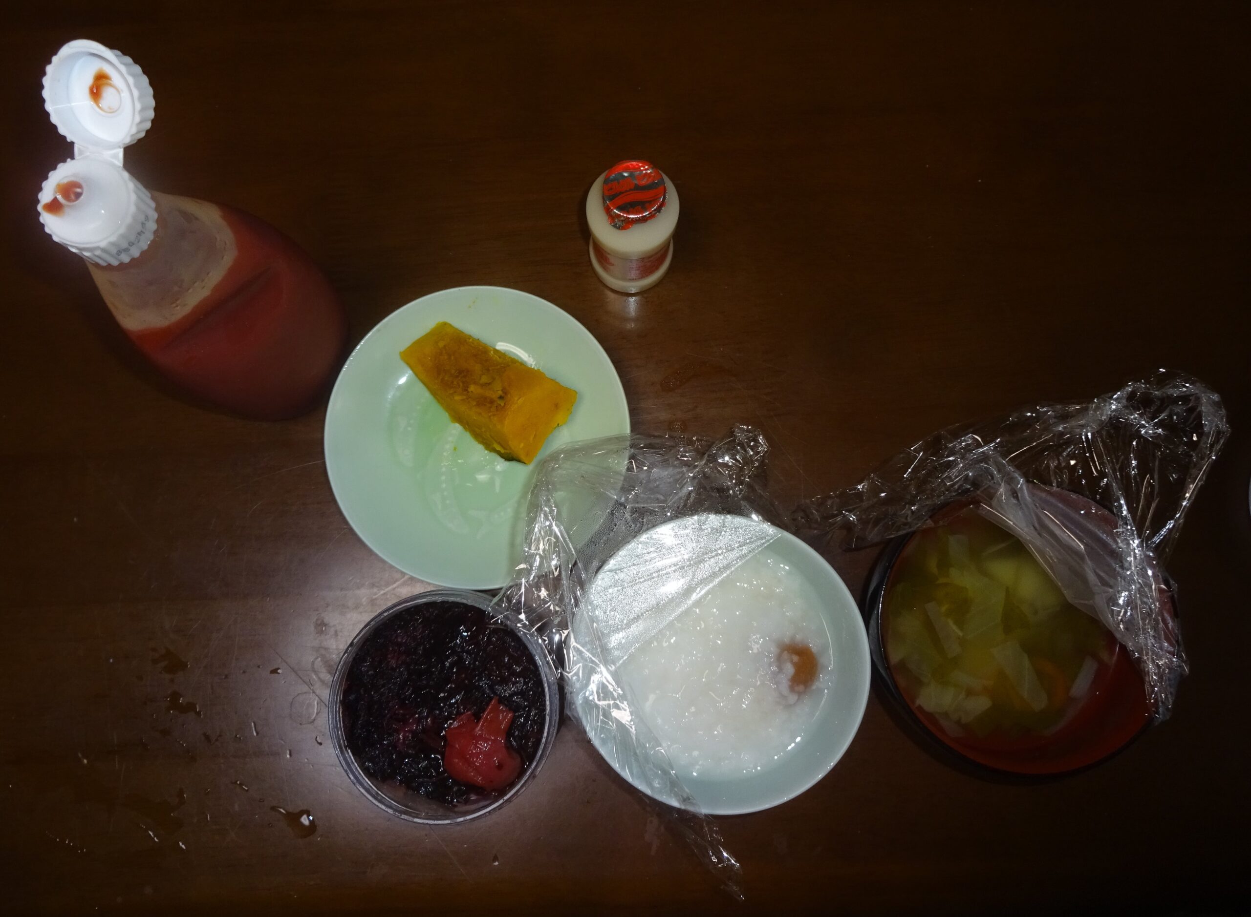 、国産の 長芋の おろし、お豆腐、柔らかい がんもどき、父親の好物である 梅干し そして 栄養ドリンクなどです。序で乍ら、柔らかい がんもどきなどを 食べ易いように 小さく 切って、父親の口元に運びました。因みに、誠に有り難いことに、父親によりますと 美味しい とのことでした。