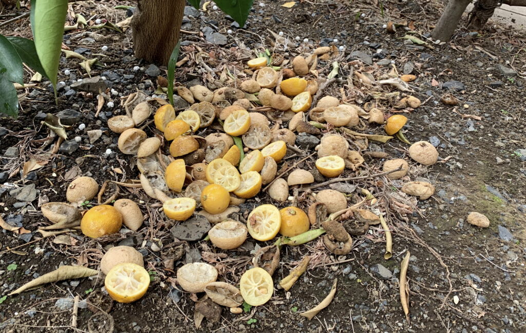それから、今回は また 父親への供養と思い、当家の庭で 朝摘あさづみをした 柚子ゆずの実を入れた お風呂の準備をしました。ちなみに、柚子ゆずの実の皮は 同じ柚子ゆずの木のために 肥料にする目的で、その柚子ゆずの木の根元ねもとに置きました。なお、あとは、土をけてやります。