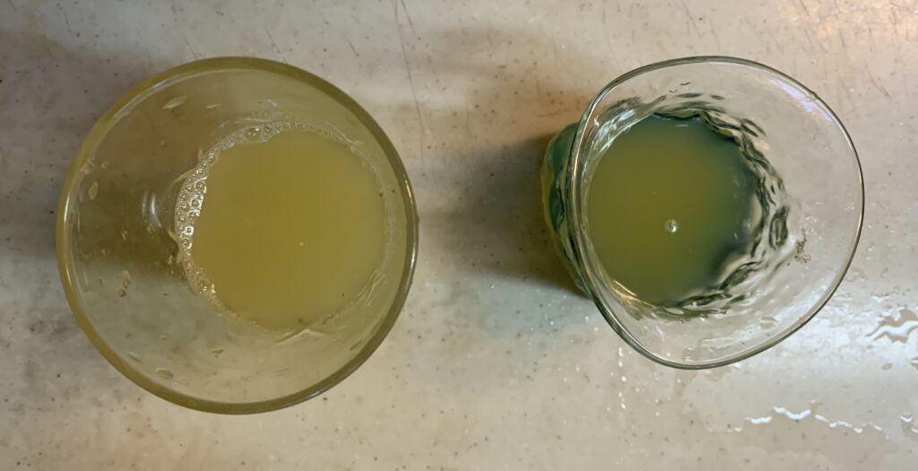 しぼった 柚子ゆずの実の汁(家政婦さんによりますと、満々なみなみいだ とのむねでありました。ところが、その家政婦さんが 冷蔵庫に入れたのでありますが、そのとびらを開きましたら、誠に勿体もったいないことに こぼれてしまいました。ちなみに、家政婦さんによりますと、自宅でためしてみたら 苦かったとのことでありました。しかしながら、誠に有り難いことに、飲むことができました)