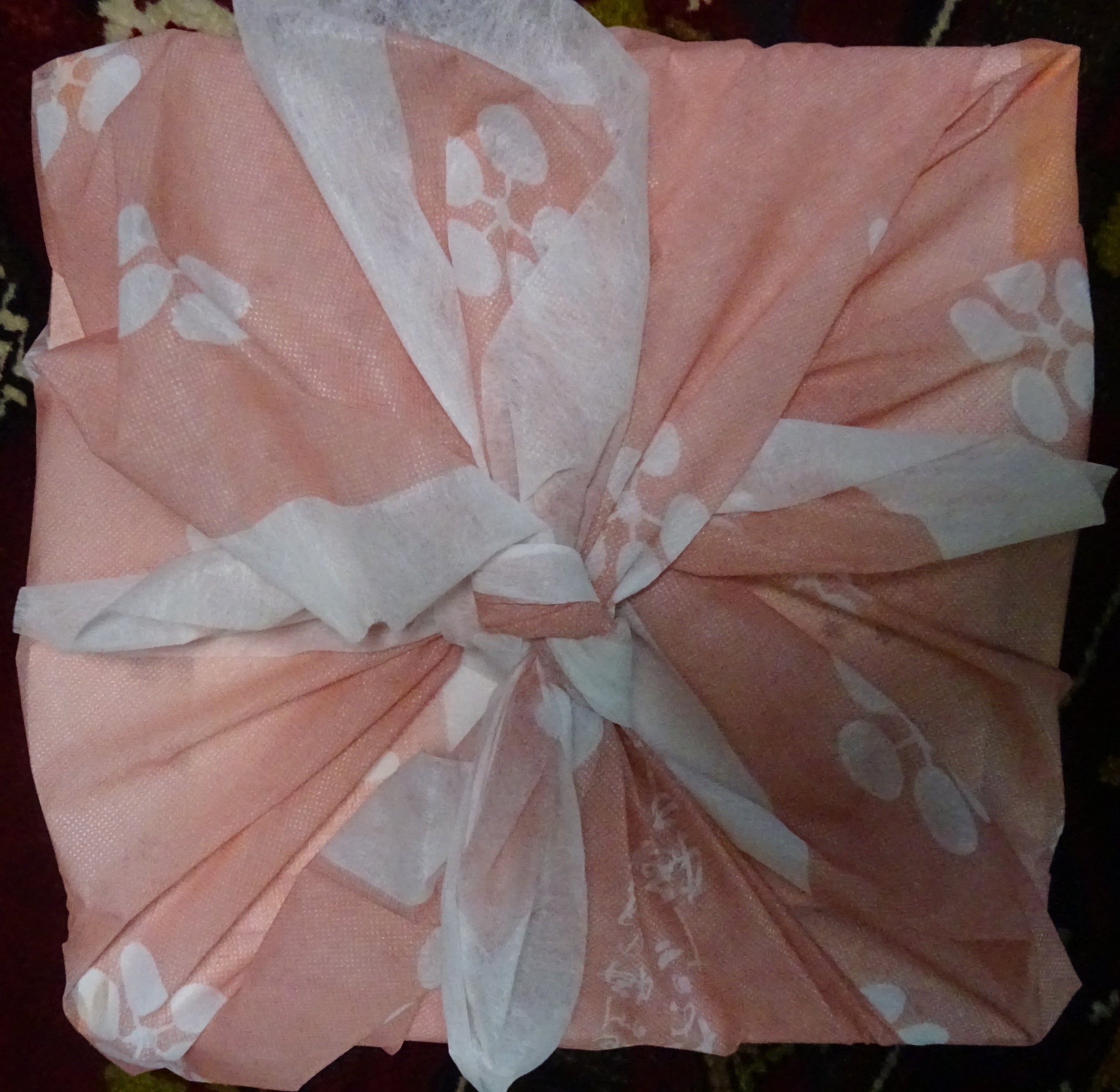 持ち帰り易いように 風呂敷で 包装した 減塩の南高梅の梅干し(1箱 すなわち 500g×2個入りを 3箱)