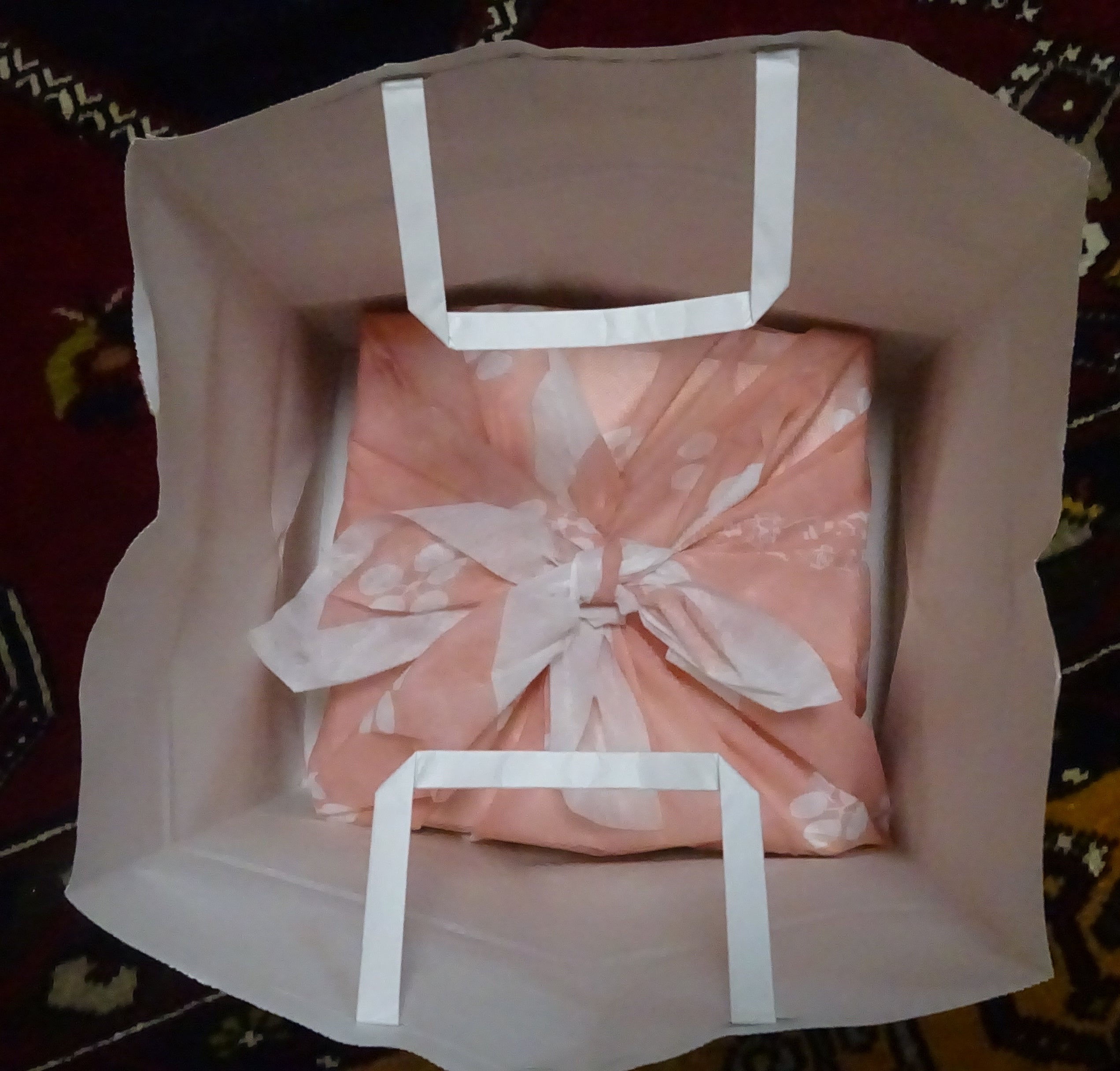 持ち帰り易いように 風呂敷で 包装して 手提げ袋に入れた 減塩の南高梅の梅干し(1箱 すなわち 500g×2個入りを 3箱)