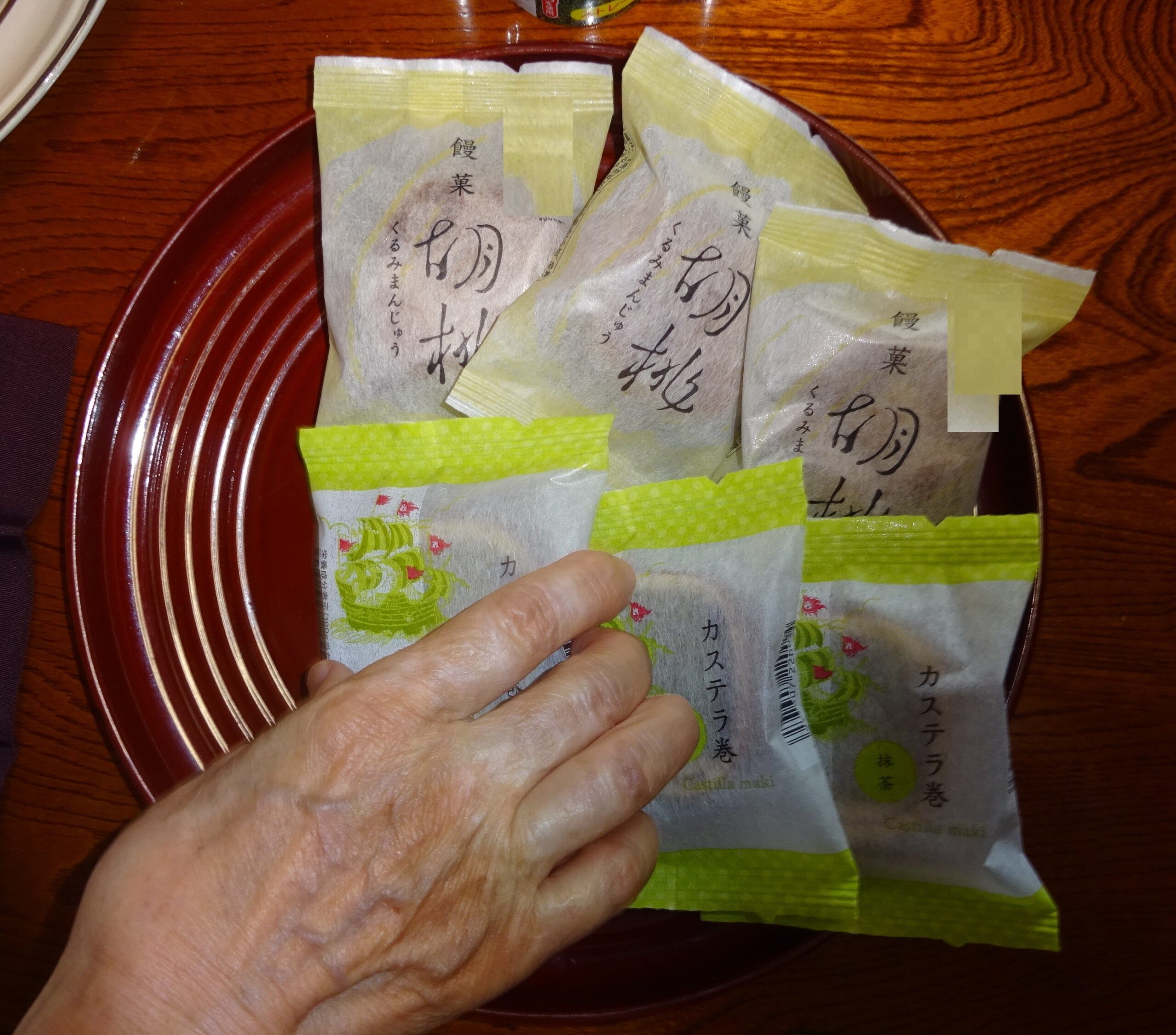 初盆終了後に 直会として 参列者に あげた 和菓子(左下は、家政婦の手であります。なお、この家政婦にも あげました)