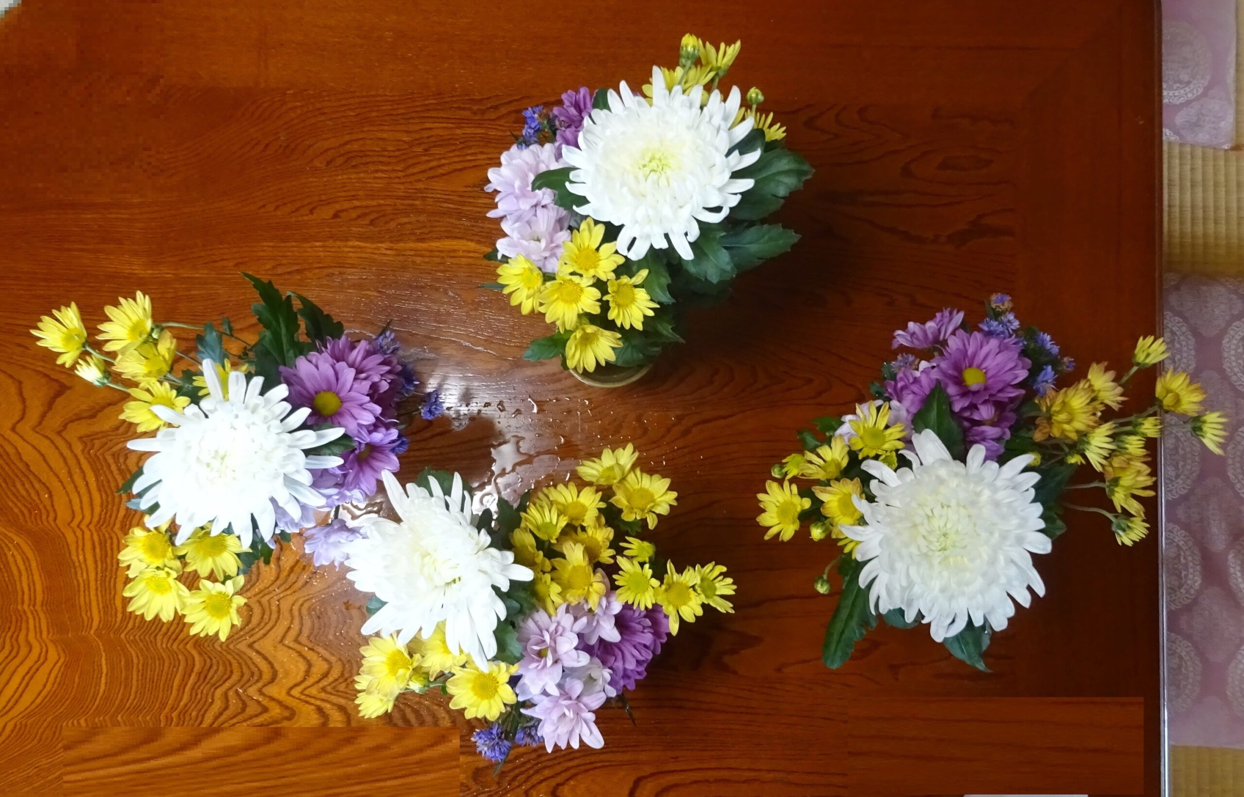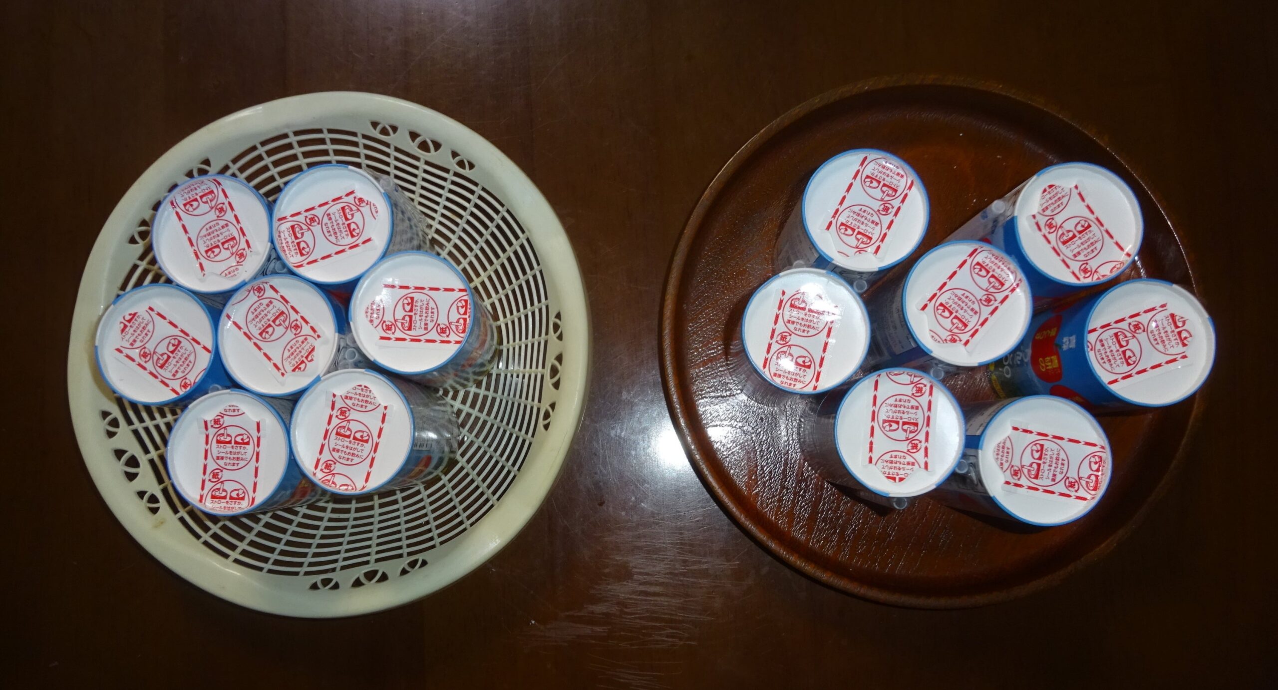 の100%ジュースを 感謝の印として 下の画像のように それぞれ 三人分を用意しました。因みに、去る6月26日の午後4時2分に 電話があり、5分で行くとのことでした。すなわち、もう1件の準備が出来れば、出発出来る とのことでした。それで、約12分後 すなわち 午後4時14分頃に 来ました。つまり、もう1件の準備に 時間が掛かったようであります。なお、その花屋の方によりますと、商品にする為には、農家から 仕入れてきても、水を与えて 水が上がる迄 待たなければならない とのことでした。序で乍ら、価格は、いつもと同じ ¥1,800円でした。因みに、その花屋の方によりますと、花が 700円とのことでした。そして、榊 が、一対で ¥350円とのことでした。それで、三対 買っているので、¥1,050円ですね。それから、差額の¥50円は、当方からのチップ(英語:tip)であると思われました。なお、今回も、上記のように ワクチンの話をしました。序で乍ら、欧米では 既に終了しているのに、当市では 4回目のワクチン接種を勧めていると話しました。すなわち、日本では 4周遅れで、未だに ワクチン接種を推進していると伝えました。すると、その花屋の方によりますと、誠に有り難いことに、納得してくれて 頷いてくれました。