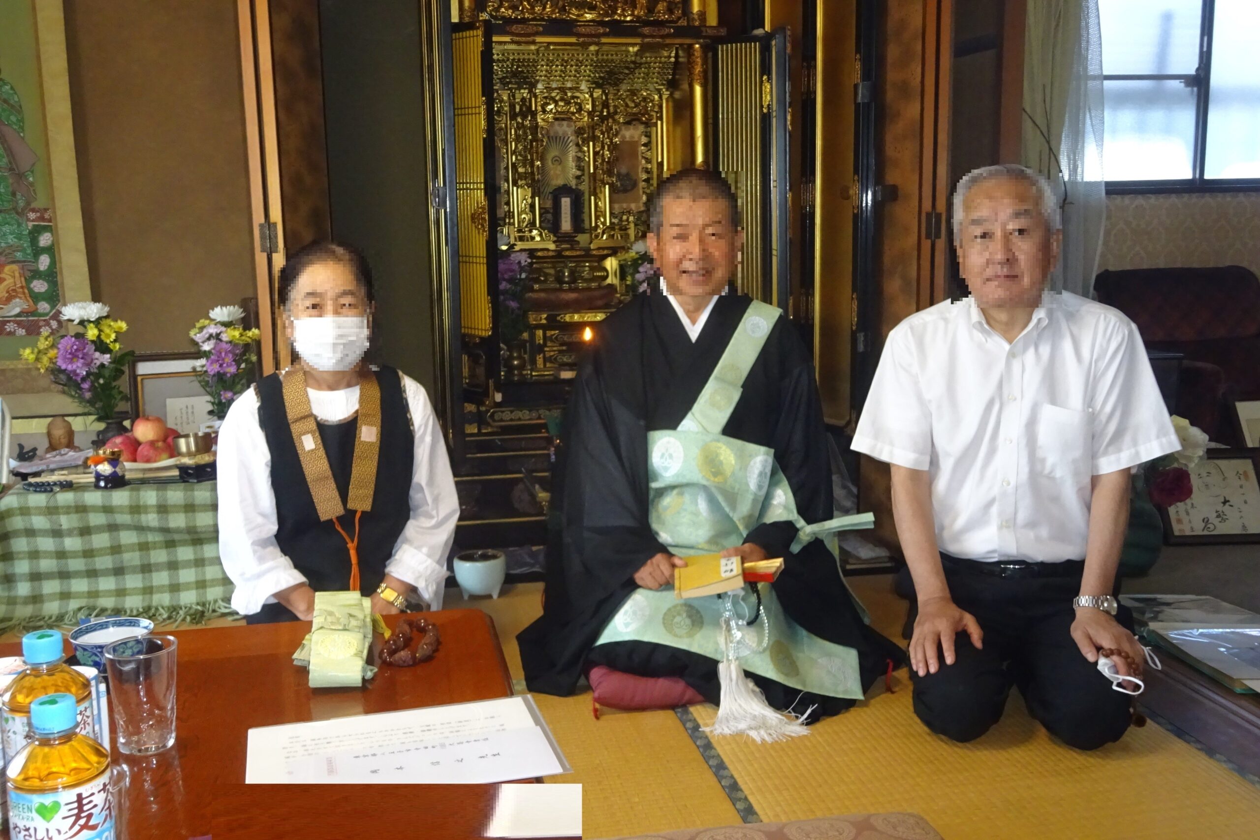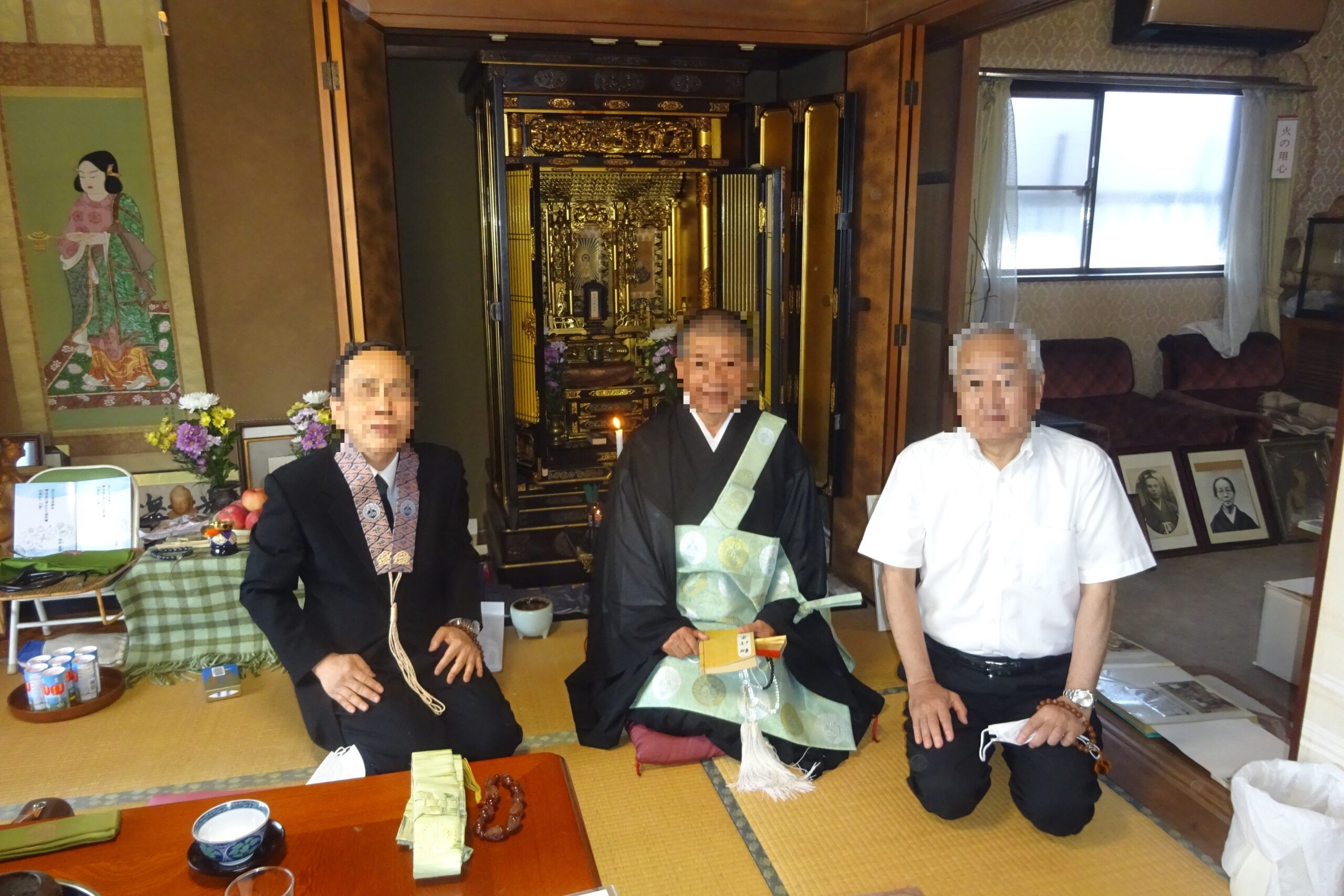 『息が切れたそのとき、悲しい別れではありますが、悲しさが、寂しさが、切なさが、喜びに転ぜられていく道が 念仏の道です。大事な人との別れ こんな悲しいときに 喜べることなんか出来る筈ない、念仏の教えに出会わない人は 皆 そのように言うに違いありません。その別れのときが 何時 何処で どのようにして ぶつかってくるか 火に焼かれていくこともあれば 水に溺れていくこともある 苦しんで逝く人もあれば ぽっくり逝く人もある 人 それぞれでありますけれども どんな風にして逝っても 息が切れたときが お浄土だよ お浄土が約束されておる お念仏を申す身とならせて頂くということはそういうことだよ 教えられるのであります。辛い 悲しい 心がグラグラ グラグラ 揺れ動く別れでは ありますけれど 正に 逝く人も 残される人も そうであり そのグラグラ グラグラ 揺れ動く心の中に ですね お念仏が出て下さり そうなんだな 有り難いことだったな お浄土に生まれさせて頂くんだったな お浄土に生まれ 仏さまとなられて これからは 私たちを 何時でも 何処でも 見ておって下さり 私たちを救う働きをしておって下さるのだな お念仏というのは 永遠にと言ってもいいんでありましょうね そうして 受け継がれていくのでありましょう。永遠の生命を恵まれていく道が お念仏の道であると言ってもいいのでありましょう。いろいろな娑婆世界での 思い出が一杯ではある 懐かしい 楽しい ときには 悲しい ビックリした いろんなことが 一杯ある人生ではありますが、振り返ってみて いろんなことが あったな あの人も この人も 逝ってしまった いよいよ 今度は自分の番かな というときが 必ず 来るのであります。自分の番が 何時 何処で どうやって 来るのか分かりませんけれども、何時 何処で そのときが来ても お念仏と一緒だから 大丈夫 大安心を頂いていくことが出来る道が お念仏の道であると言ってもいいのでありましょう。苦しいことがないように、悲しいことがないように、辛いことがないように、一生懸命 お願いをする というのが 浄土真宗ではありません。どんなことにぶつかっても お念仏があるから 大丈夫と堂々と どんなことでも 真正面から ぶつかっていく 誰のせいにする迄 もなく 何のせいにする迄 もなく 自分のこととして そのまんまを受け止めていくことの出来る心を教えられる このお念仏の道であります。今日は ○○さんの初盆 招いて頂きましたこと 誠に嬉しく 有り難く思うことで 私の父も母も亡くなりましたけれど、誓願寺での御縁のときの写真を 一杯 ○○さん(当方のこと)から出して下さって 懐かしく 何か 私の父も一緒に居て下さるような 母も一緒に居て下さるような、また 奥様もお祖母ちゃん 私が小学校のときから このお祖母ちゃんには 誓願寺で お世話になっている 本当に50年どころじゃない 60年位の御縁が 今迄 ずっとある○○家であります。今日 お勤めさせて頂きましたこと 有り難く思うことであります。どうも 有り難う御座いました。』以上であります。そして、家政婦によりますと、いつもと同じ話とのことでした。