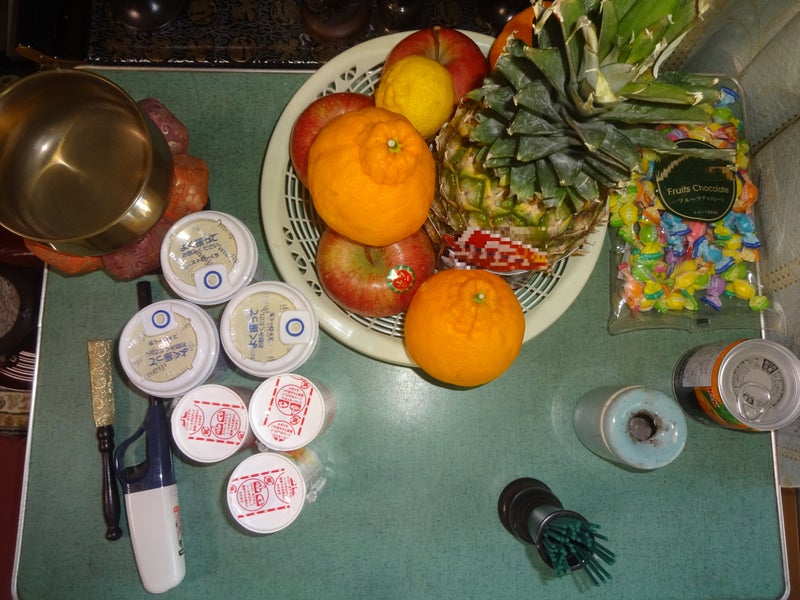 【(前略)上記のように 母親の好物の 蜜柑の缶詰、フルーツ・チョコレート以外にも、好物の お供えを 揃えさせて頂きました。