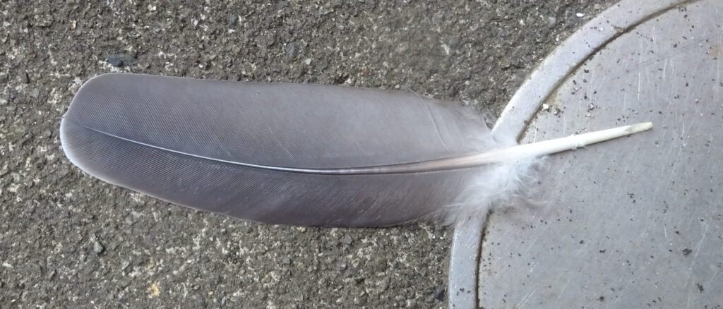 加うるに、本日 当家の敷地内で、下の画像の 鳥の羽根(「羽」が鳥の体に付いている状態 や 翼 そのものを指すのに対し、「羽根」は 抜け落ちて バラバラになった 1枚 1枚を指します。従いまして、この場合は 明らかに 「羽根」でありますね)が落ちていました。因みに、下の画像を見せましたら、家政婦さんによりますと、烏の羽根であるとのことでありました。なお、烏の羽根にしては あまり 黒くないのでありますが、生え始めの羽根であるという話になりました。