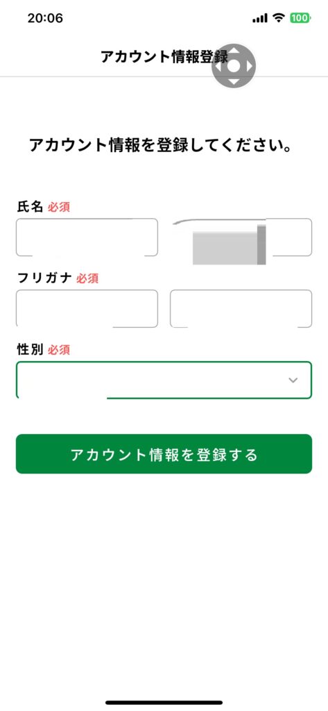氏名、フリガナ、性別を入力し、 アカウント情報を登録する ボタンをタップします
