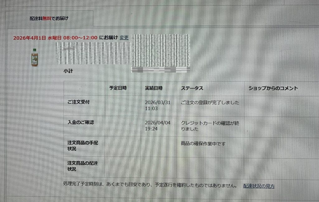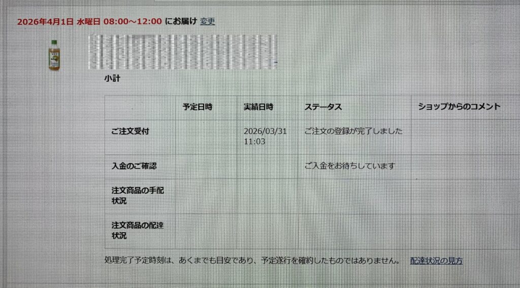 誠に遺憾なことに、決済されているにもかかわらず、ステータスが「ご入金をお待ちしています」であり、ショップからのコメントには 何も書かれていないのであります。因みに、上の画像のように、午前 11:03に 「ご注文の登録が完了しました」になっております