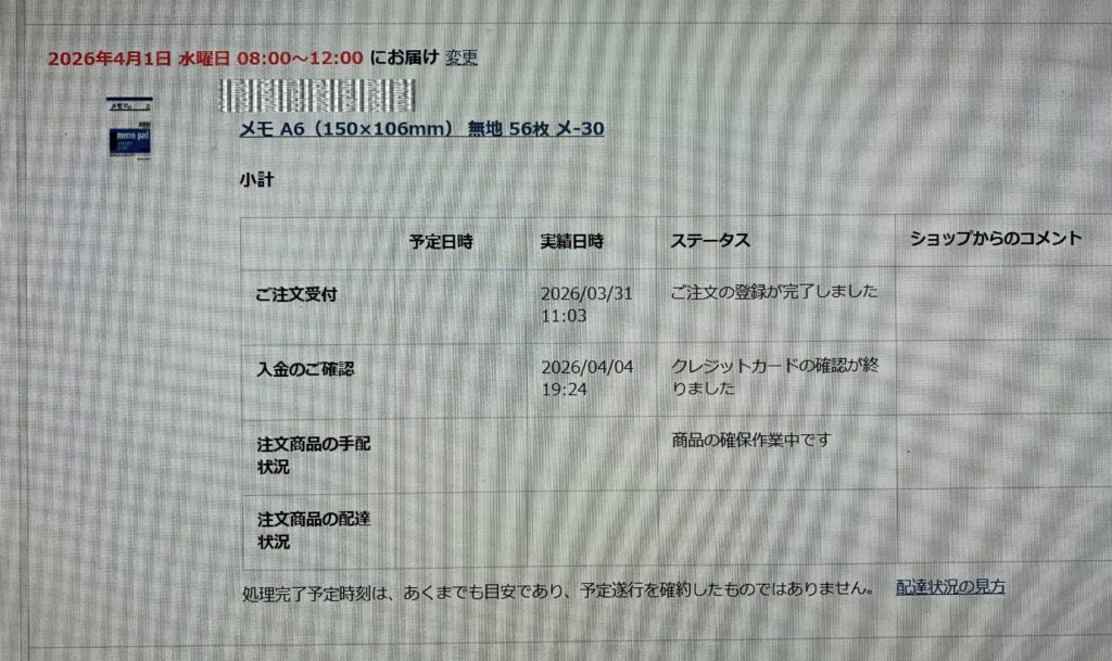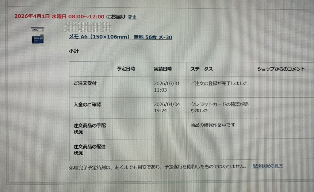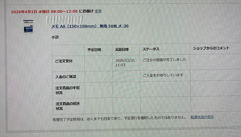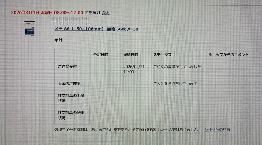 誠に遺憾なことに、決済されているにもかかわらず、ステータスが「ご入金をお待ちしています」であり、ショップからのコメントには 何も書かれていないのであります。因みに、上の画像のように、午前 11:03に 「ご注文の登録が完了しました」になっております。なお、メモ用紙の配送が 二 つに 別れています