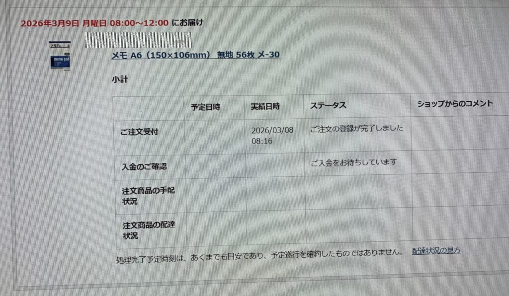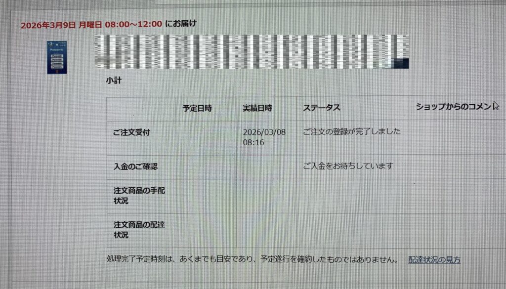 誠に遺憾なことに、決済されているにもかかわらず、ステータスが「ご入金をお待ちしています」であり、ショップからのコメントには 何も書かれていないのであります。因みに、上の画像のように、午前 8:16に 「ご注文の登録が完了しました」になっております