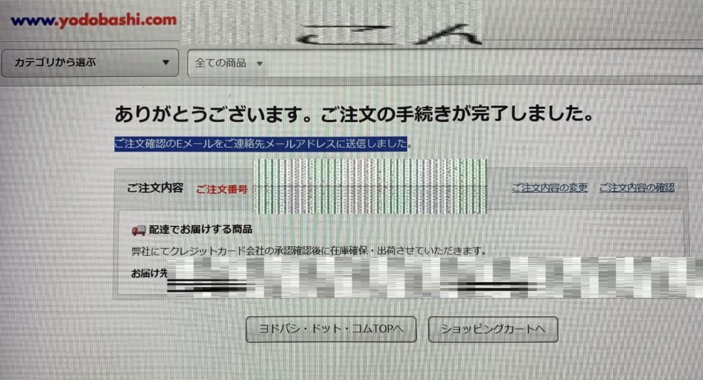 ときに、本日 午前 8:16に、前述いたしました ヨドバシ・ドット・コムで クレジットカードで 決済をおこないました。すると、下の画像のように 「ご注文の登録が完了しました」とのことであり 「ご注文確認のEメールをご連絡先メールアドレスに送信しました」とのことでありましたが、誠に遺憾なことに、連絡先メールアドレスに 送信されていません。しかも、上記と同じく 誠に遺憾なことに、何故か 決済が 適わないのであります。それで、仕方がないので 悶々とし乍ら 待つことになります。すなわち、5時間10分以上も 待たされるということであります。これでは、当日 配送を謳っていても、決済が 適わないのでありますから 上記のように 誠に遺憾なことに、遅れることになりますね。