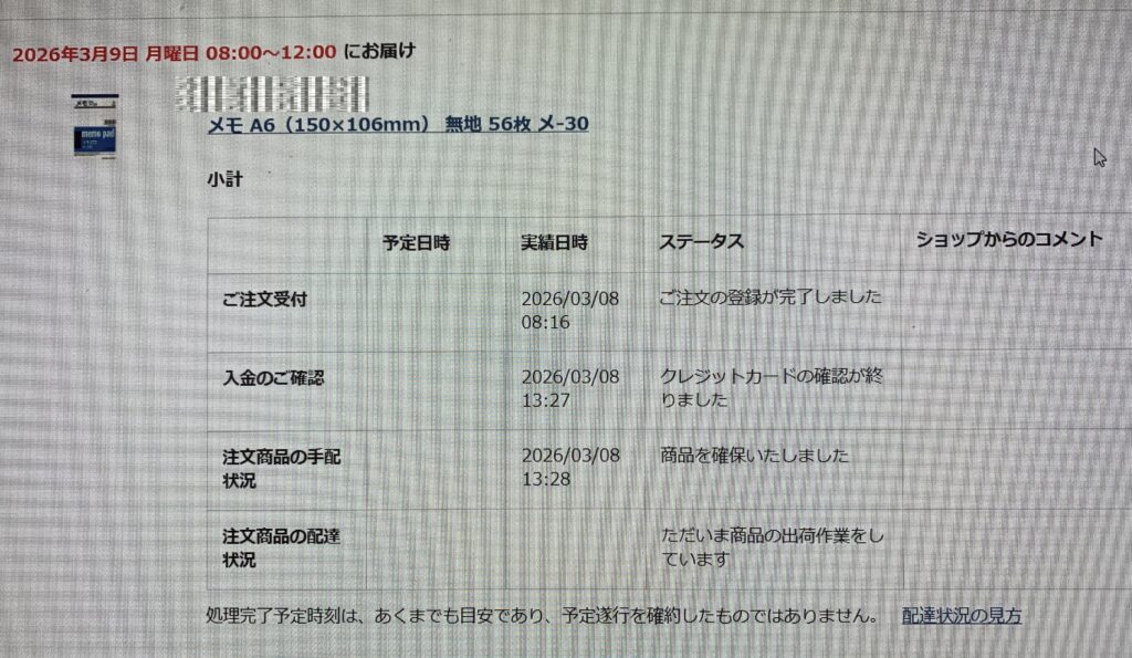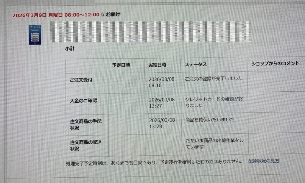および、上記のように 午前 8:16に ステータスが「ご注文の登録が完了しました」になってから、約5時間11分が経過しました。そして、下の画像のように 漸く 午後 1:27になって 初めて ステータスが「クレジットカードの確認が終りました」になりました。