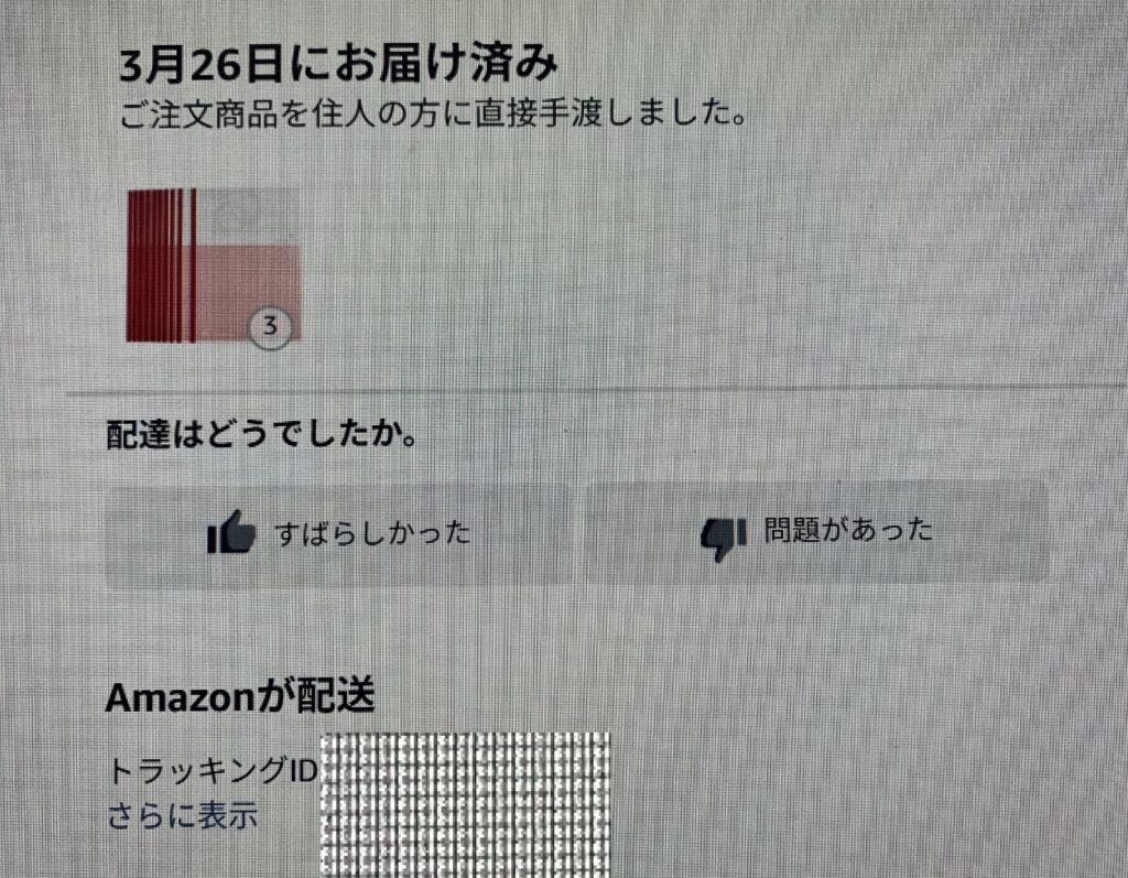 なお、本日 すなわち 3月26日(木)の日没後の 午後6時48分頃に 当家のチャイムが鳴りました。序で乍ら、同じ日の配達でありましたが、誠に遺憾なことに、配達が 別れました。因みに、置き配 扱いになっていますが、誠に異例なことに、一方の配達は 直接の手渡しでありました。なお、Amazonの配達は 置き配にしていますので、直接の手渡しは 珍しいことなのであります。序で乍ら、いつものように 置き配と思っていましたので、日没後に チャイムを鳴らされて 慌てました。因みに、印鑑を持って行きましたら、捺印が不要とのことでありました。なお、下の画像のように、いつも 〔すばらしかった〕で 回答していることを伝えました。但し、会話の交流で その宅配便の配達員は 日本人では ないようでありました。