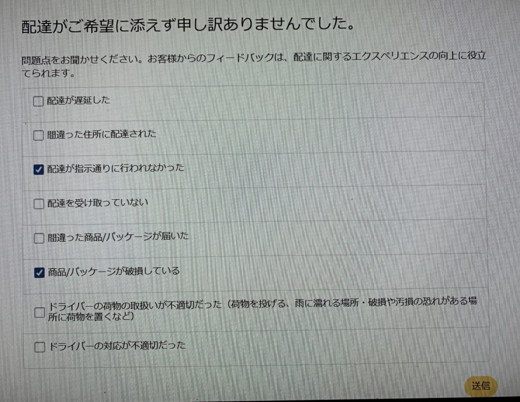 〔すばらしかった〕 と 〔問題があった〕の二者択一のアンケート(単に 前述いたしましたように 〔商品/パッケージが破損している〕と〔配達が指示通りに行われなかった〕の2ヶ所に チェックを入れました)