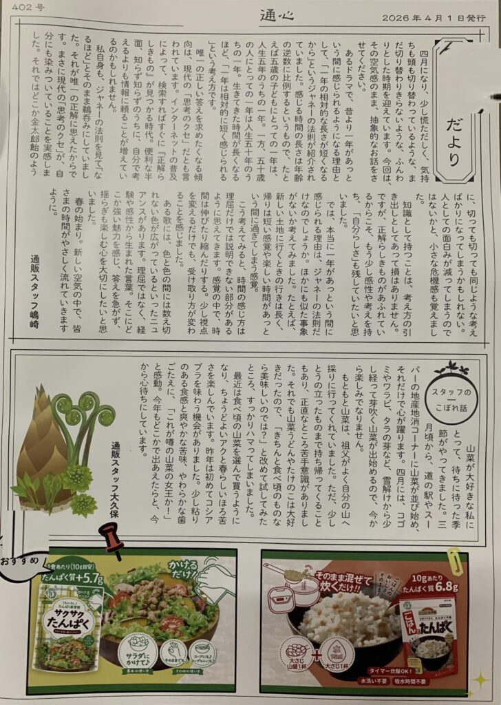 しかして、〖毎回 全ポイント利用いたします。〗になっているにもかかわらず、誠に遺憾なことに、数年前 すなわち 去る 令和3年10月11日に この契約が 破られて 発送されることがありました。それで、態々 時間を作って 電話連絡をすることになりました。すなわち、最初に 〖前川〗という女性受付が出て、次に 〖山田〗という 女性上司が 出ました。そこで、その旨を話しますと、その女性上司によりますと、商品を受け取らず 返送してくださいとのことでありました。但し、食品であるので 賞味期限があると思われ 返送すると 相手が困ると思われ 考慮いたし 受け取ることにしました。但し、スタッフの 止めどもない こぼれ話が書かれてある 通信を送ることは 基本的な 契約が守られて 初めて 送られるべきであることを伝えました。すなわち、契約が しっかり守られることが ハッキリする迄は その通信を送ることは 控えるように と話しました。それで、お互いに 合意しました。ところが、誠に遺憾なことに、今回、下の画像のように その通信が送られてきました。因みに、先日 すなわち 去る 令和8/4/10 (金) に届いた 〖商品を発送しました〗とのメールには、確かに 〖通信・レシピはお入れしません。〗と書かれてあります。にもかかわらずであります。それで、便りを送ることにしました。なお、この作業が 朝迄 掛かりました。要するに、今回も、寝ないで 作成させて頂き 翌日の 午前中になりました。