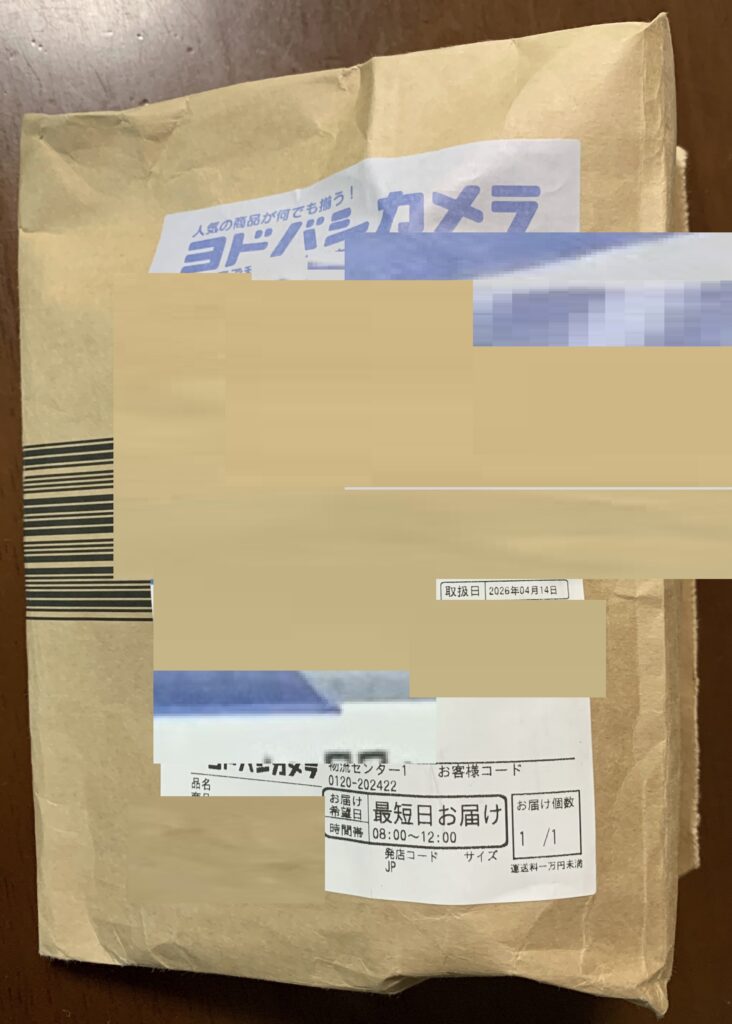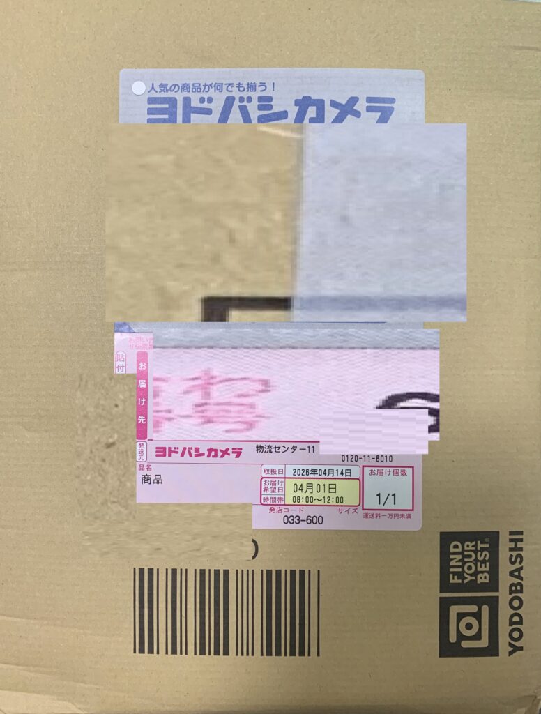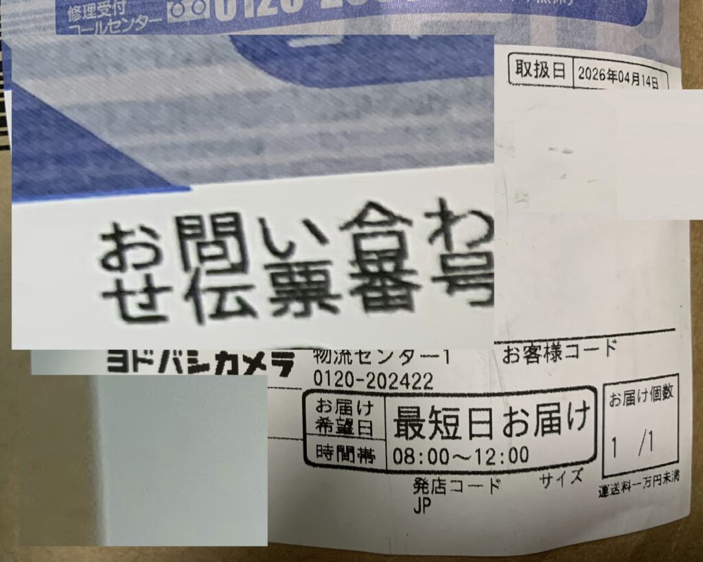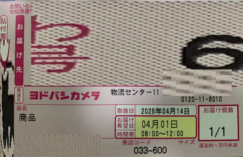 誠に有り難いことに、届いた 商品の貼付票(前述いたしましたように、誠に遺憾なことに、ヨドバシ・ドット・コムからの 配送が 16日間も 大幅に遅 れました。因みに、上の画像に記させていますように、去る 4月1日の午前中に到着する筈でありました。ところが、誠に遺憾なことに、上記のように 一昨日 すなわち 4月14日に発送されて 本日 家政婦さんの来る 10分前の 誠に多用なときに 届きました)
