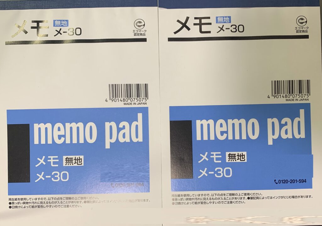 誠に有り難いことに、届いた 商品(環境の 為に 再生紙を用いた メモ用紙 注文した 7冊の内の2冊[日本製]。因みに、誠に遺憾なことに、上の画像のように 表紙の 歪み や 傷が確認できます。なお、誠に遺憾なことに、右側のメモ用紙の表紙は めくれていますね)