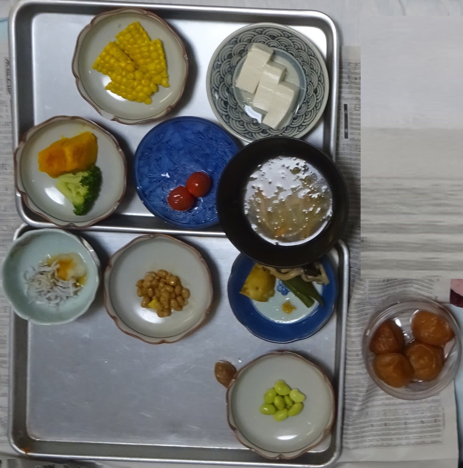 父親の朝食の一部(父親が 前日 寝られなくて 食欲がない と言うので、少しずつ 料理の品目を出しています)