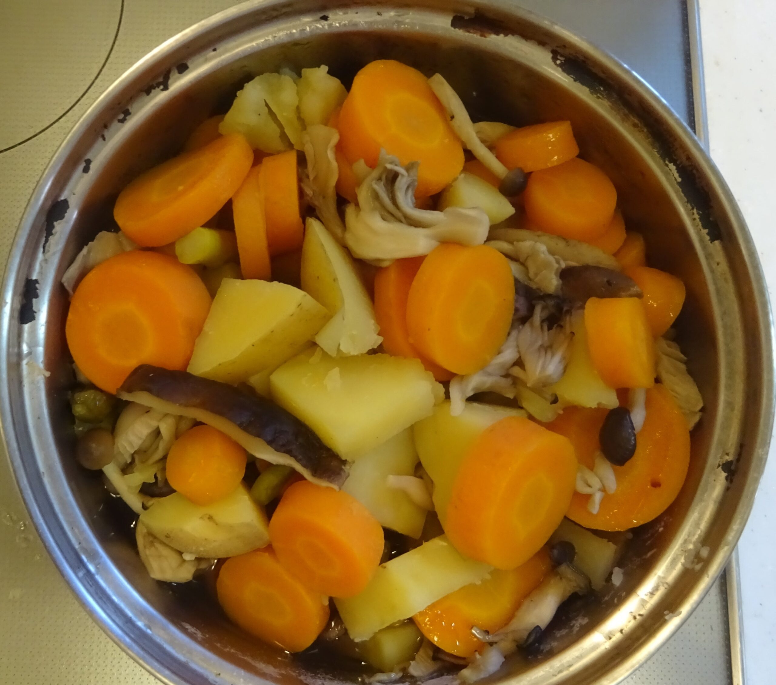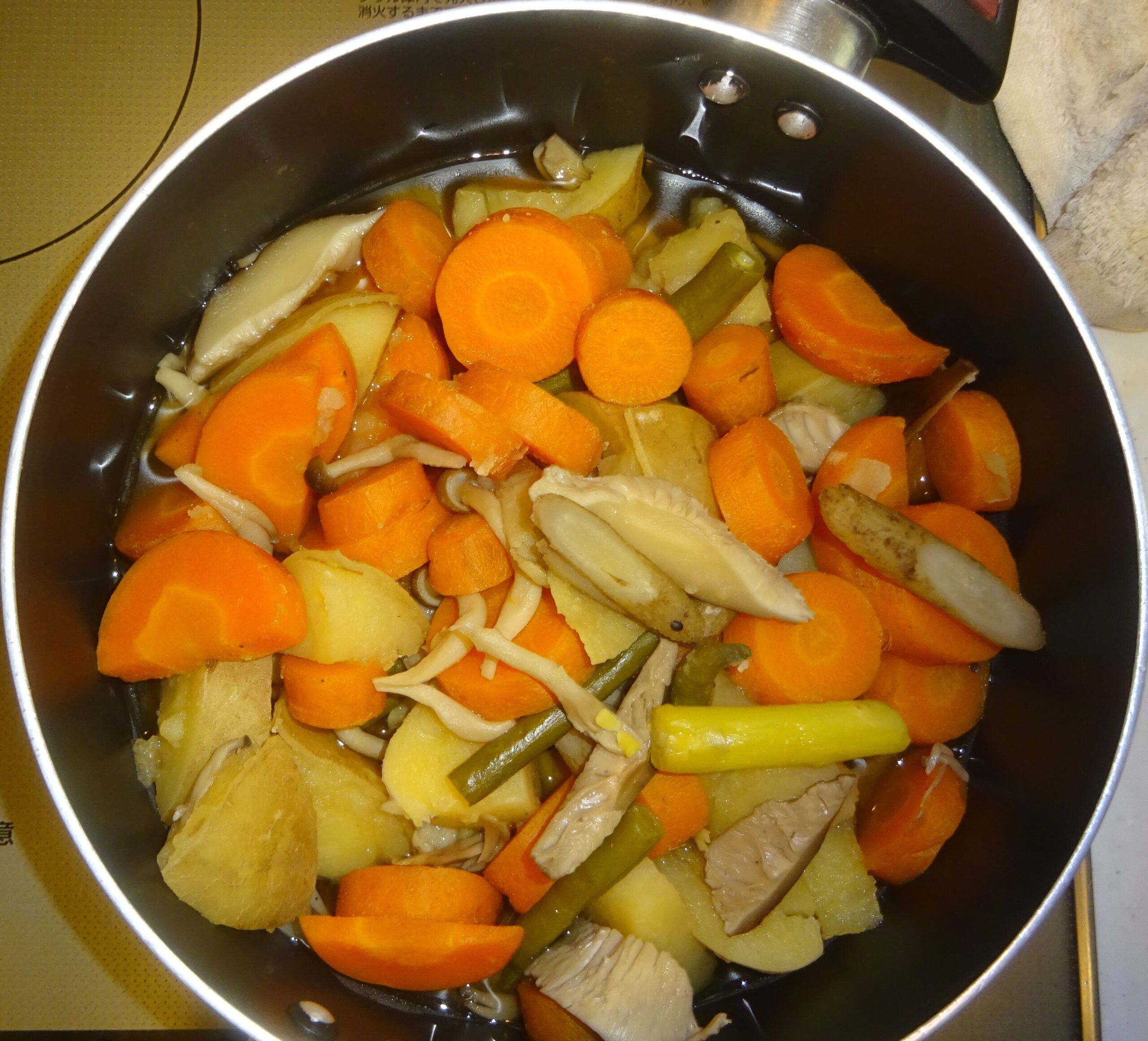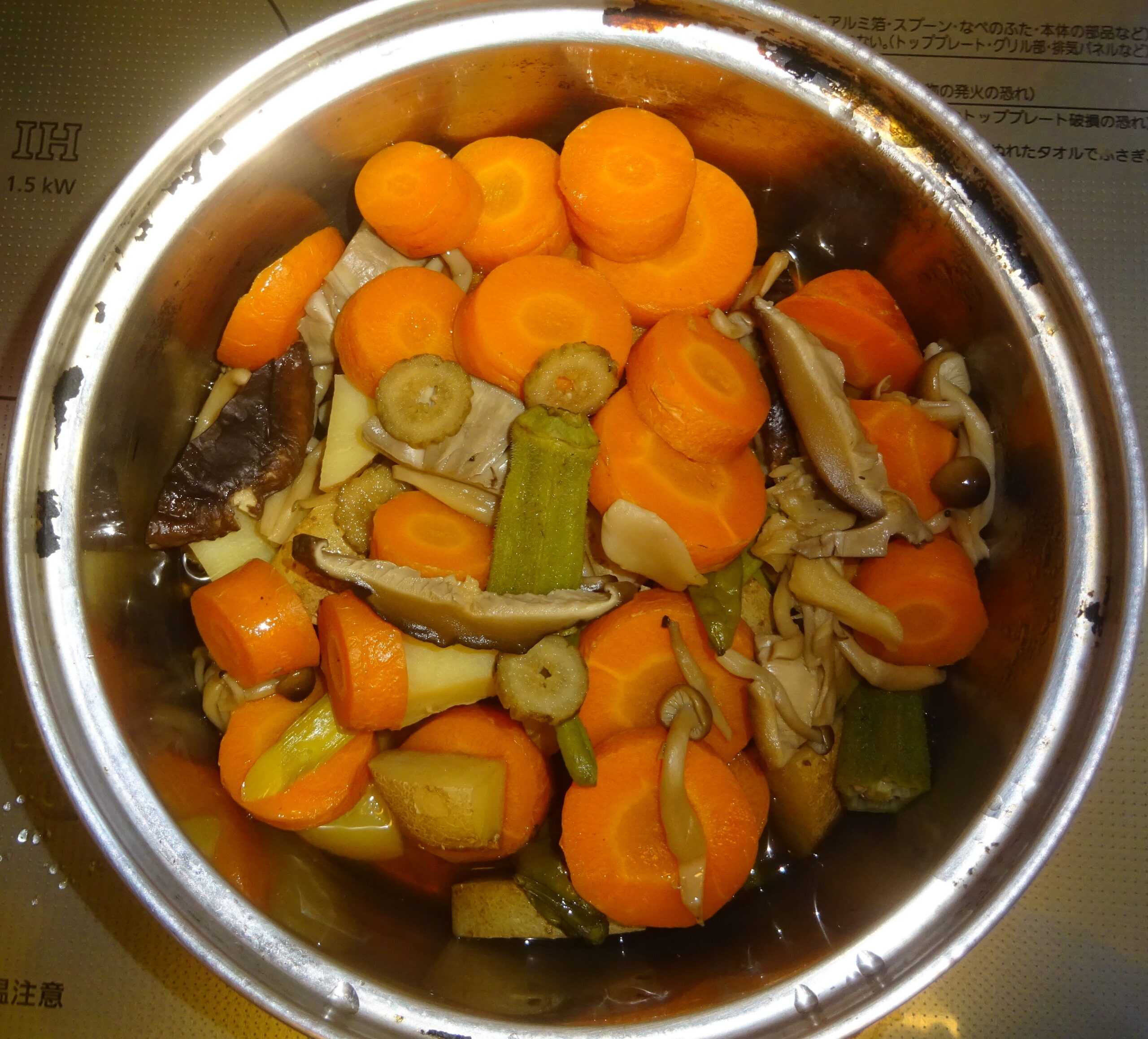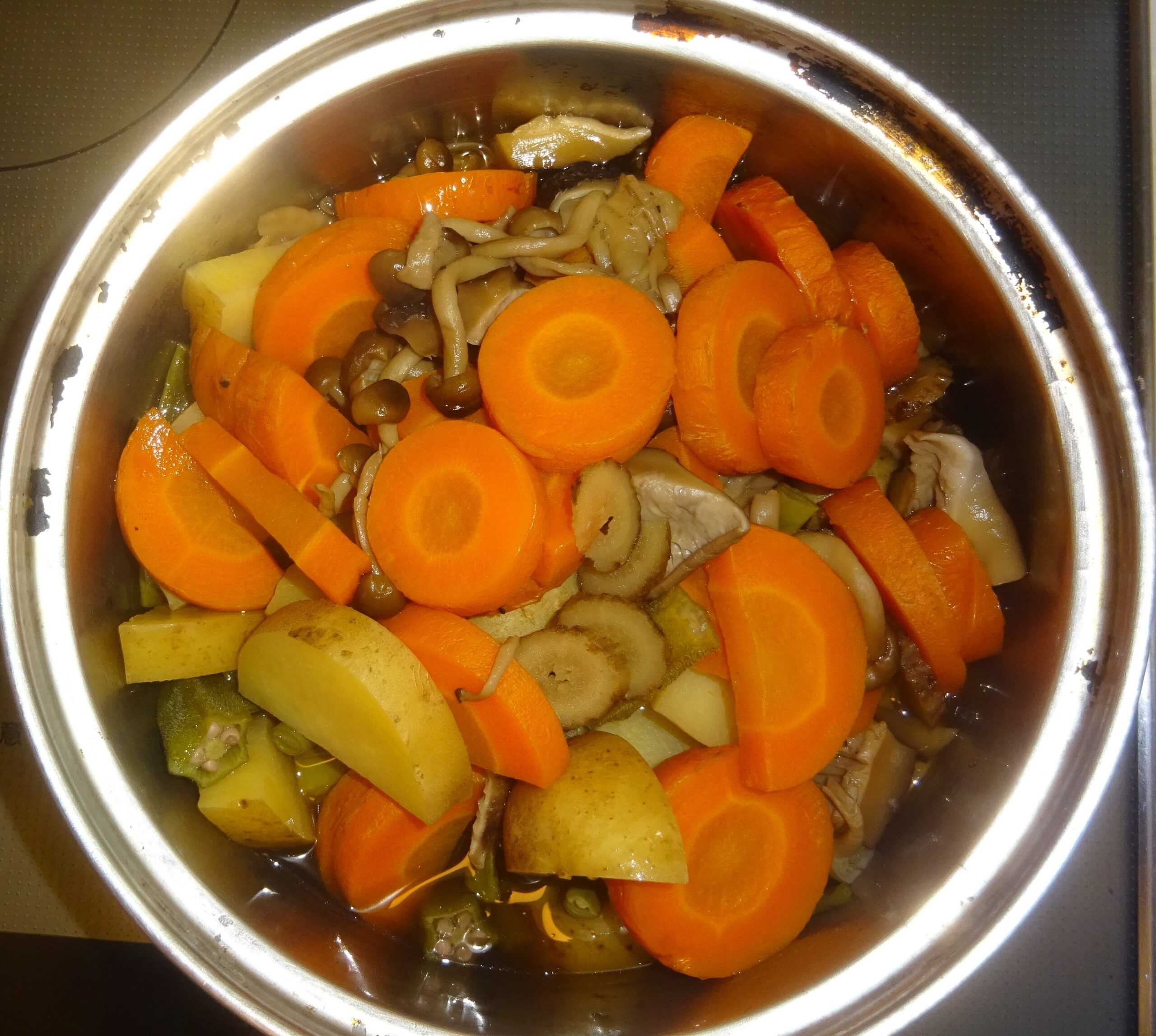 なお、去る 一昨年の5月29日(水)の「鰻の蒲焼・329(カレーうどん・父親の食事)」のブログの下段に、「(前略)昨日 すなわち 5月28日(火)の『鰻の蒲焼・328(カレーうどん・父親の食事)』のブログの下段に、『(前略)但し、人参そのものが持つ 脂質があることが、約12年前 すなわち 平成19年の8月の学会で発表されました。 因みに、人参の脂質は、人参1kg当り 1gと 非常に少量ですが、カロテンの吸収力を アップさせる力があります。すなわち、加熱することで 脂質が カロテンに触れ、カロテンが 脂質に溶け、吸収されやすい形になっていることが分かりました。(後略)』と記させて頂きました。すなわち、人参には 自らの脂質があり 熱を加えることによって カロテンが そこに溶け出し 吸収率を上げてくれるので、余分な油は要らず むしろ それは 中性脂肪の増加に繋がることになります。また、100℃では カロテンの量に変化は ないのですが、200℃になると 熱で カロテンが壊れるので、高温の炒め物より 煮物のほうが 吸収率が上がり 健康的 とされています。(後略)」と記させて頂きました。なお、煮るのに 時間が掛かる 人参 そして 椎茸などを 先に茹で始めて、後から 煮崩れを起こし易い 馬鈴薯 や 早く 茹で上がる青物などを入れて 煮るようにしています。序で乍ら、家政婦が煮た 人参が 硬かったのです。それで、家政婦によりますと、人参は 内側が 柔らかくて、外側が 硬いとのことでした。そこで、内側を 箸で刺して 煮えたかどうかを調べたのであるが、外側が 硬かったのが 分からなかったとのことでした。