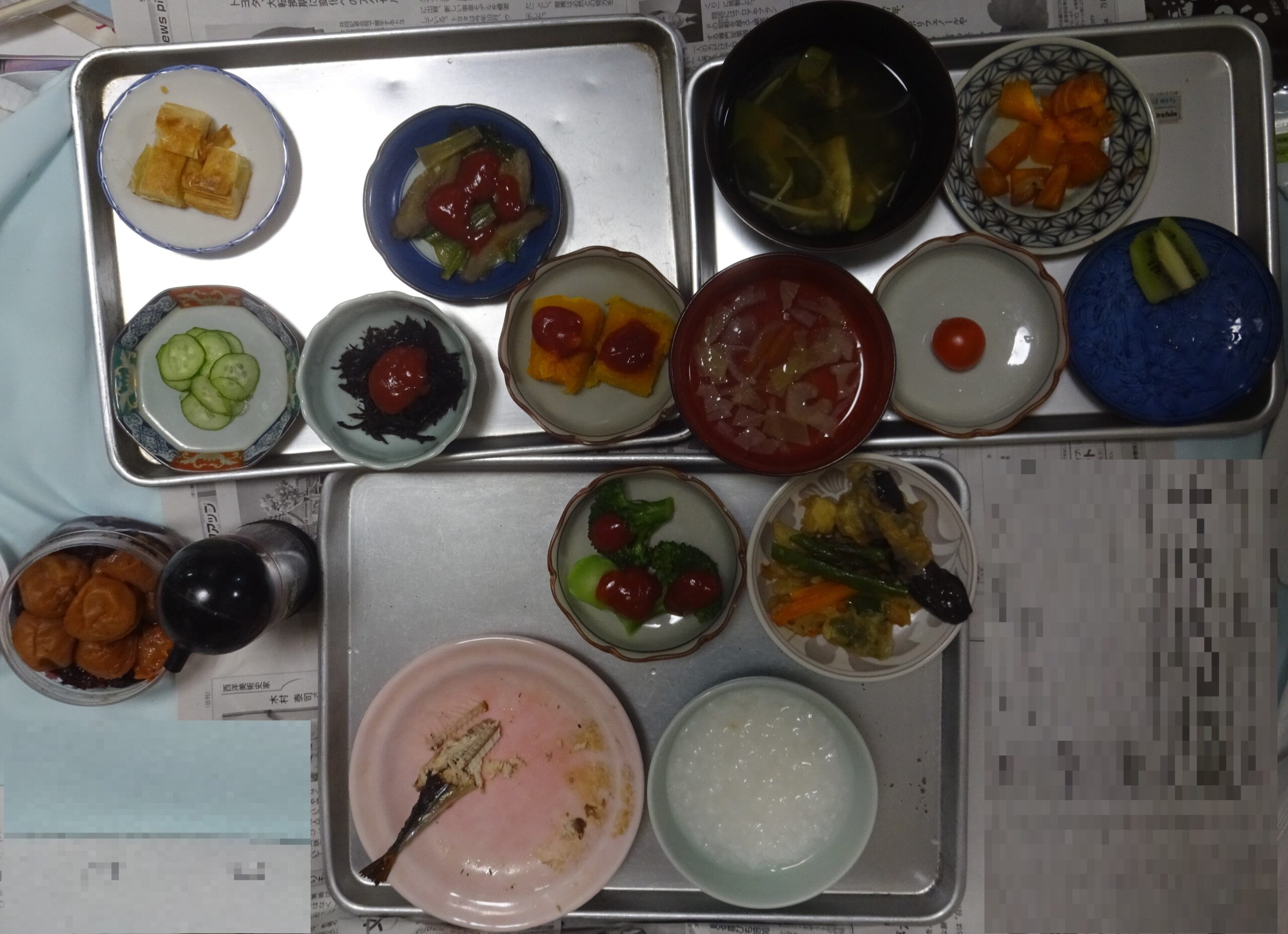 父親の朝食の一部(その上の画像の 父親の朝食を下げて、更に 新たに 料理の品目を増やしています。食べ掛けて 食べ進んでいます)