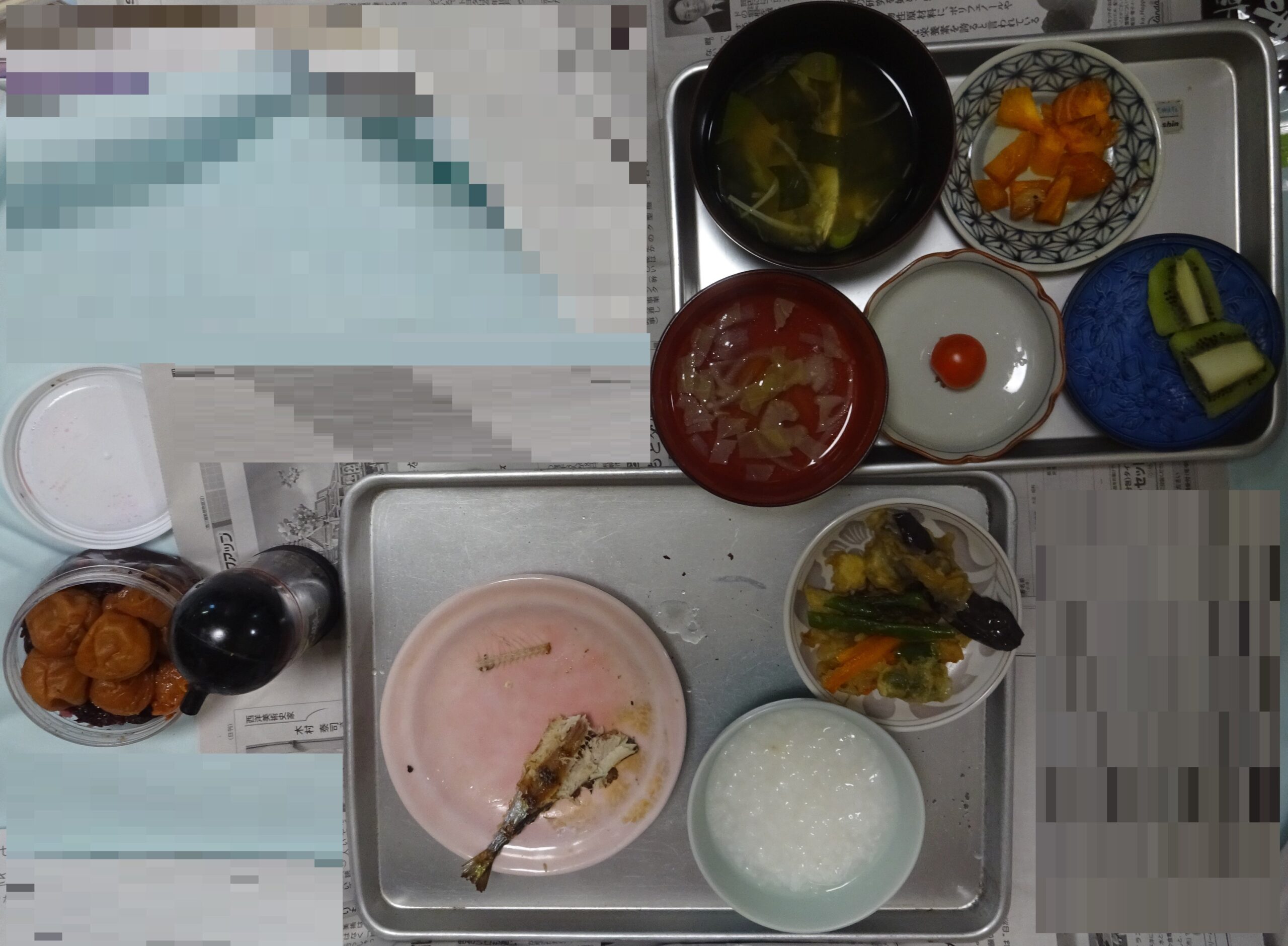 父親の朝食の一部(父親が 前日 寝られなくて 食欲がない と言うので、少しずつ 料理の品目を出しています。食べ掛けています)