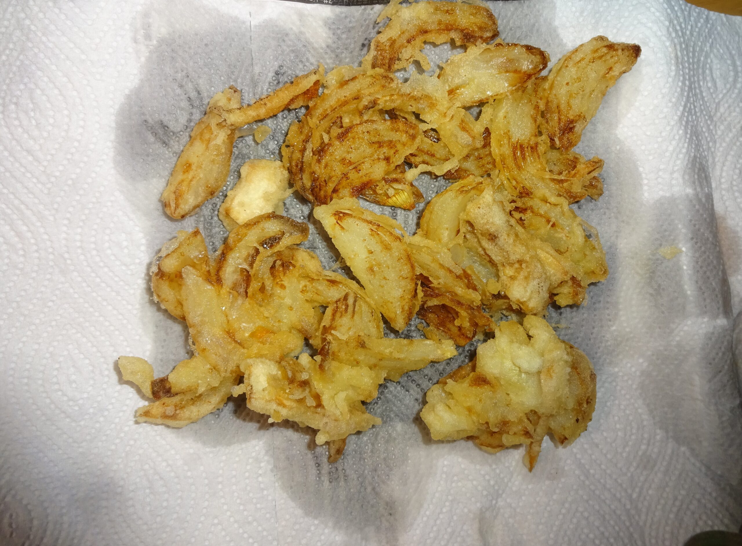 〔(前略)親鸞聖人の好物と伺った 精進揚げ(野菜天ぷら)(人参、牛蒡、いんげん、舞茸、玉葱 そして 南瓜)です。 因みに、一週間前に、 ヘルパー(日本語:家政婦)には、心の準備をしてもらう為に、小麦粉 と 片栗粉を用いて 衣にして 精進揚げ(野菜天ぷら)を作ってもらうことを伝えてありました。勿論、小麦粉 と 片栗粉の現物も見せました。ところが、当日になって このヘルパー(日本語:家政婦)によりますと、片栗粉を使ったことがない とのことでした。それで、事前に調べてありましたので、小麦粉 と 片栗粉の比は 10:1であることを伝えました。しかも、手引書を印刷して来て、このヘルパー(日本語:家政婦)に手渡しました。なお、去る8月19日(日)の〘家政婦への贈り物(鰻の蒲焼・161[父親の食事])〙のブログの中段やや下に、
