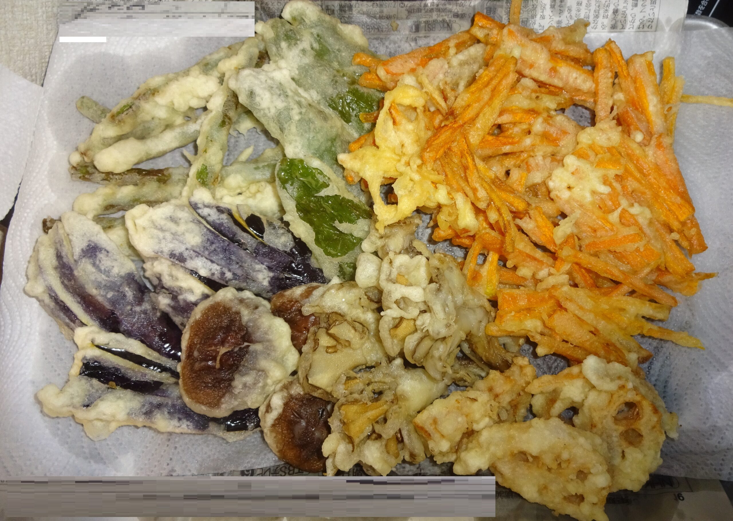 〘(前略)このヘルパー(日本語:家政婦)によりますと、天ぷらを揚げるときに 天ぷら粉を使うと 難しい とのことでした。なお、天ぷらを カリッと揚げる為には 片栗粉を使う とのことでした。 因みに、このヘルパー(日本語:家政婦)によりますと、自分の母親は 卵を使っていたが、自分は 使わない とのことでした。(後略)〙と、別のヘルパー(日本語:家政婦)のことを記させて頂きました。(後略)〕と記させて頂きました。そして、今回は、前回 衣が硬かった とのことなので、手引書の割合ではなくて 小麦粉 と 片栗粉の比は 20:1にしました。また、牛蒡が 硬かったとのことなので 素材から外しまして、替わりに 茄子を 素材に加えました。(後略)〗と記させて頂きました。そして、今回は、ヘルパー(日本語:家政婦)によりますと 小麦粉がほとんどない とのことでしたので、あまり 天ぷらを作ることは出来ませんでした。(後略)】と記させて頂きました。今回は、小麦粉を買い足しました。 因みに、蓮根 そして ピーマンが加わっています。(後略)』と記させて頂きました。上記のように、精進揚げ(野菜天ぷら)です。(後略)」と記させて頂きました。