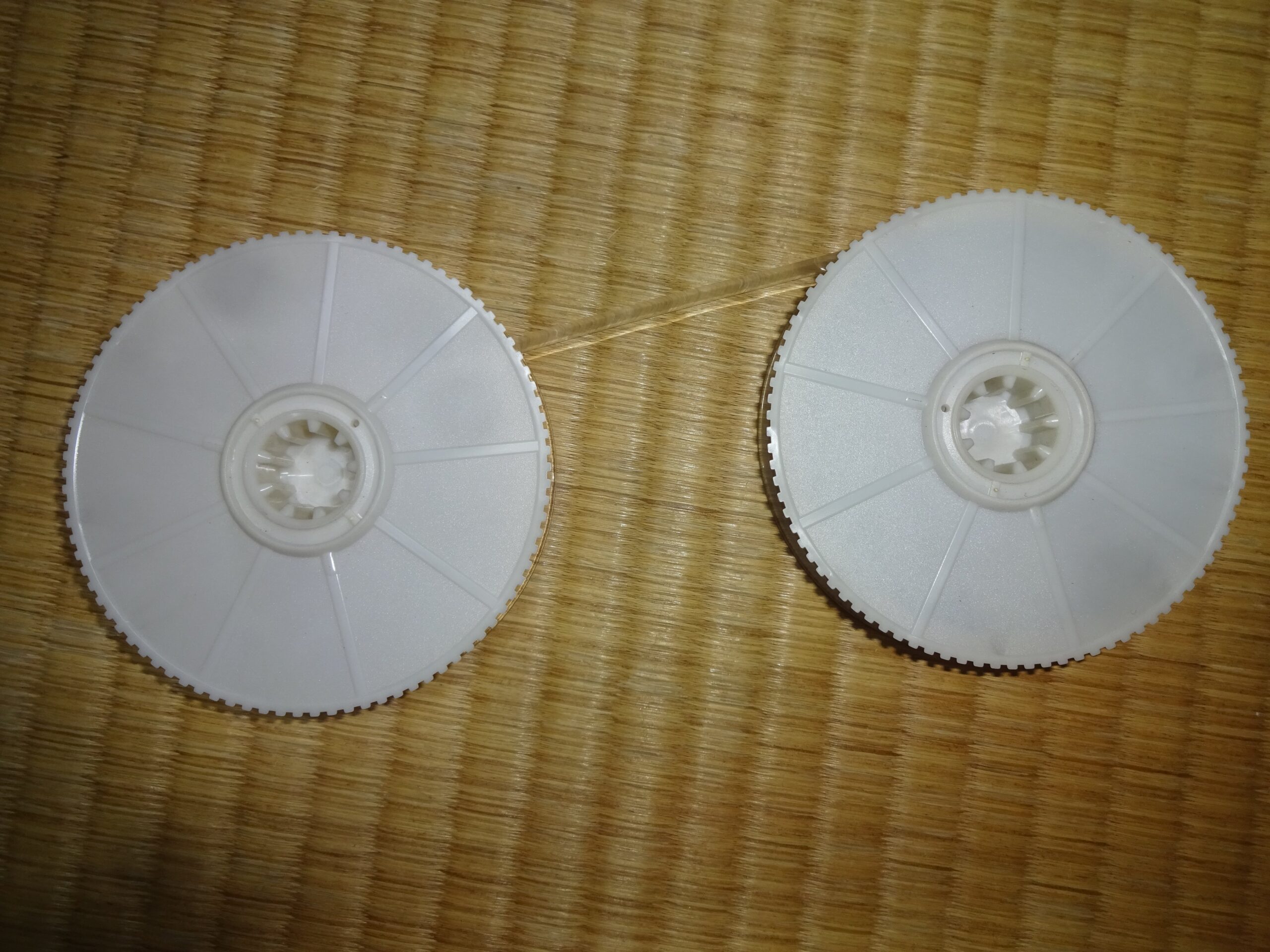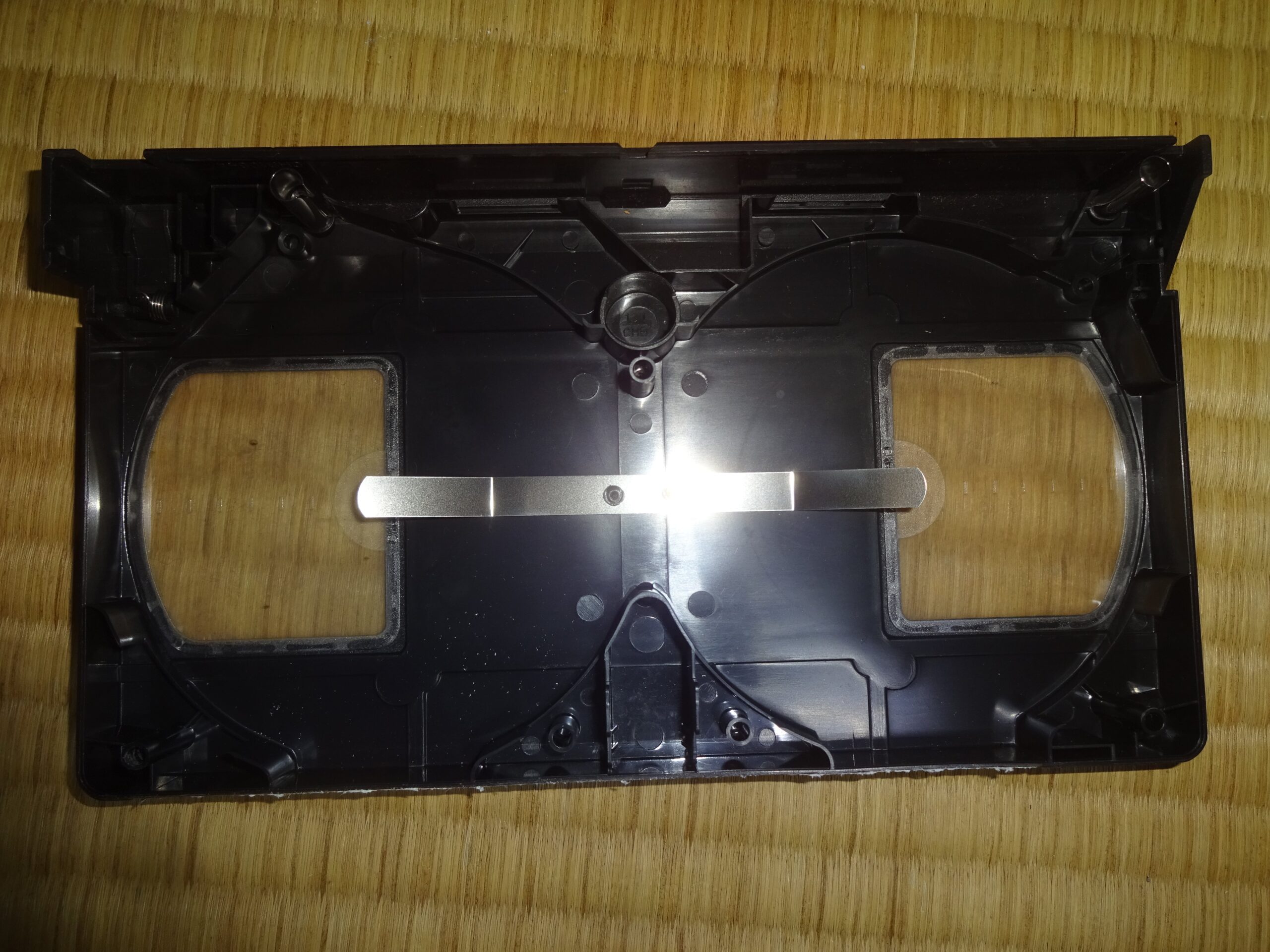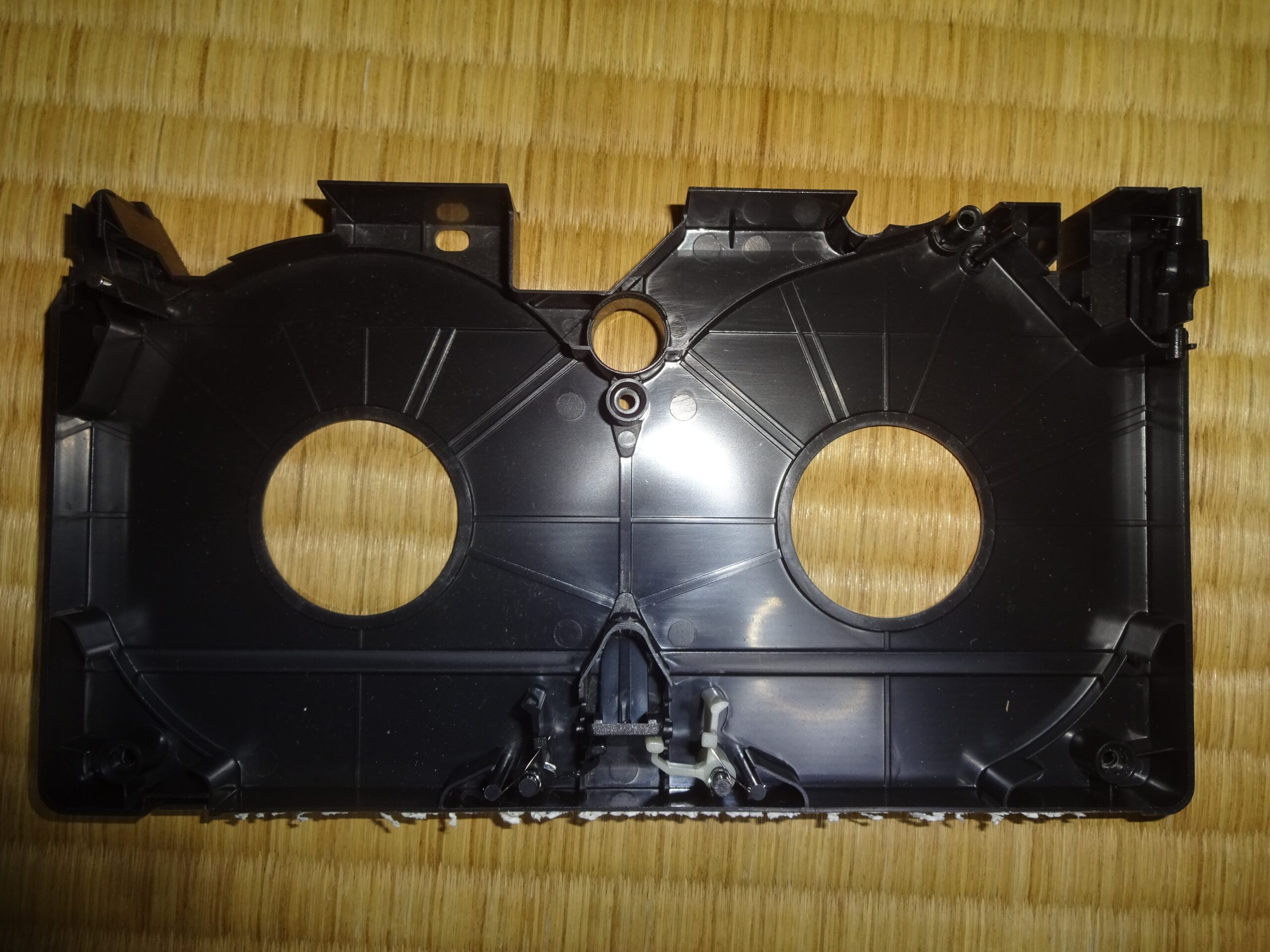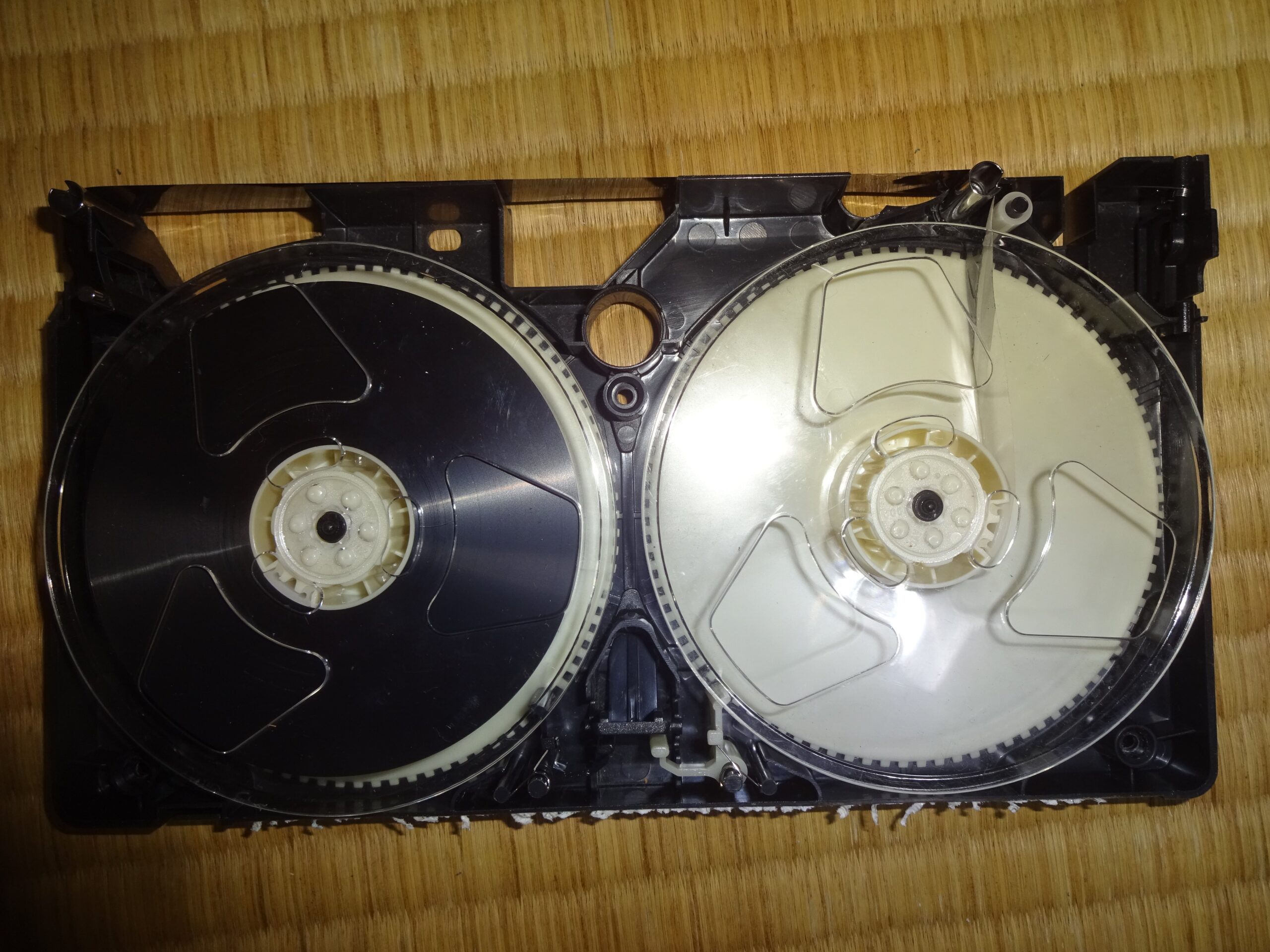 それから、分解するときに 内部の部品が バラバラになってしまいますので、元通りにします。このとき 元通りにすることが分からなくなりましたら、もう一つのV.H.S.テープのケースを そっと開けてみて 確認することになります。そして、下の画像のように 配置をして 組み立てることが 最善であると思われました。なお、このことは、過去に 何度も 試行錯誤しました。