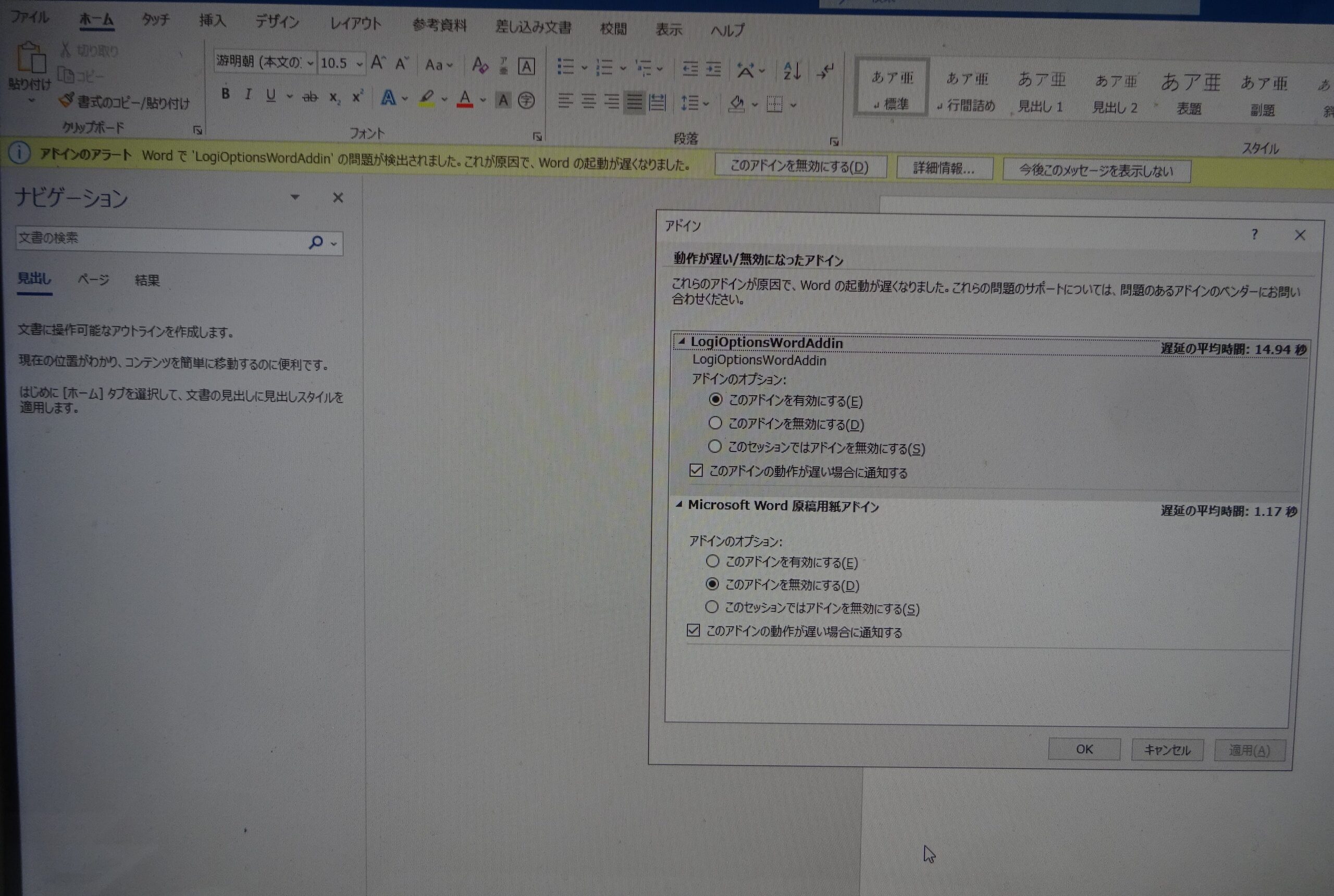 しかも、下の画像のように、この製造会社のソフトが原因 すなわち “LogiOptionsWordAddin”の問題であり、“Word”の起動が 約15秒も おそくなるとの表示が出ました。それで、この“Addinアドイン”を無効にしても 不具合が しょうじないかどうかをきました。すると、『【WARD(“Word”のことであると思われます)(の“Addinアドイン”)を無効にしてよいか】どうかの件ですが、より詳細な検証のため、テクニカル部署と検証を行わせていただきたいので モニターにある警告のでた画面の写真をお送り・・・』とのことでありましたので、下の画像のように 早速 送りました。