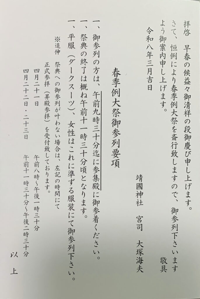 しかして、本日、誠に有り難いことに、靖國神社・春季例大祭 参列要項が届きました。