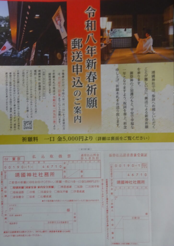 ならびに、誠に有り難いことに、今月も、月刊誌である「靖國」、祈願用紙、初詣の案内、福引券(毎年 その家政婦さんに あげていましたが、今年は 届きませんでした)、御神札 そして 祈願用紙などが届きました。因 みに、上記のように 毎月、この機関誌を その家政婦さんに あげています。