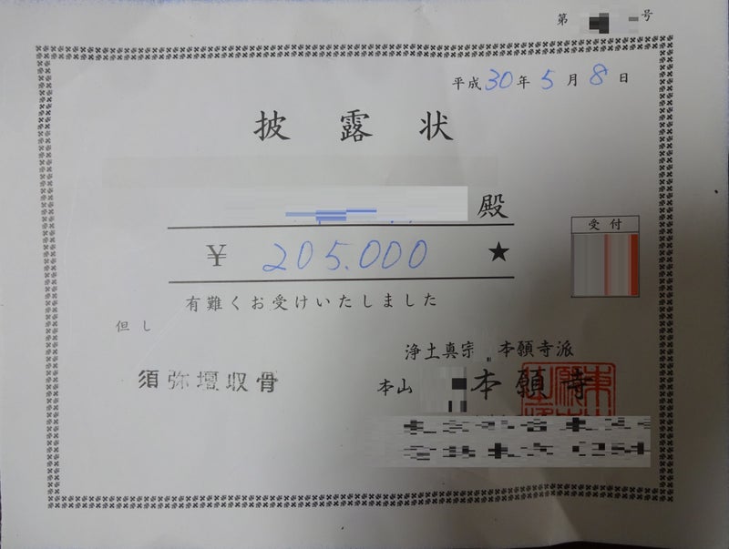『(前略)去る3月6日(火)の【母親の転帰】のブログに記させて頂きましたように、母親が 亡くなりました。そして、去る3月8日(木)の【うなぎ蒲焼かばやき・73(お通夜・父親の食事)】のブログ そして 去る3月9日(金)の【うなぎ蒲焼かばやき・74(告別式・父親の食事)】のブログに記させて頂きましたように、お通夜 と 告別式がありました。それから、七七日 すなわち 四十九日の納骨がありました。(後略)』と記させて頂きました。そして、某・本願寺の須弥壇に 収骨(分骨)しました。 ちなみに、お布施は 金20万円とのことでした。また、読経志として 金5千円とのことでした。