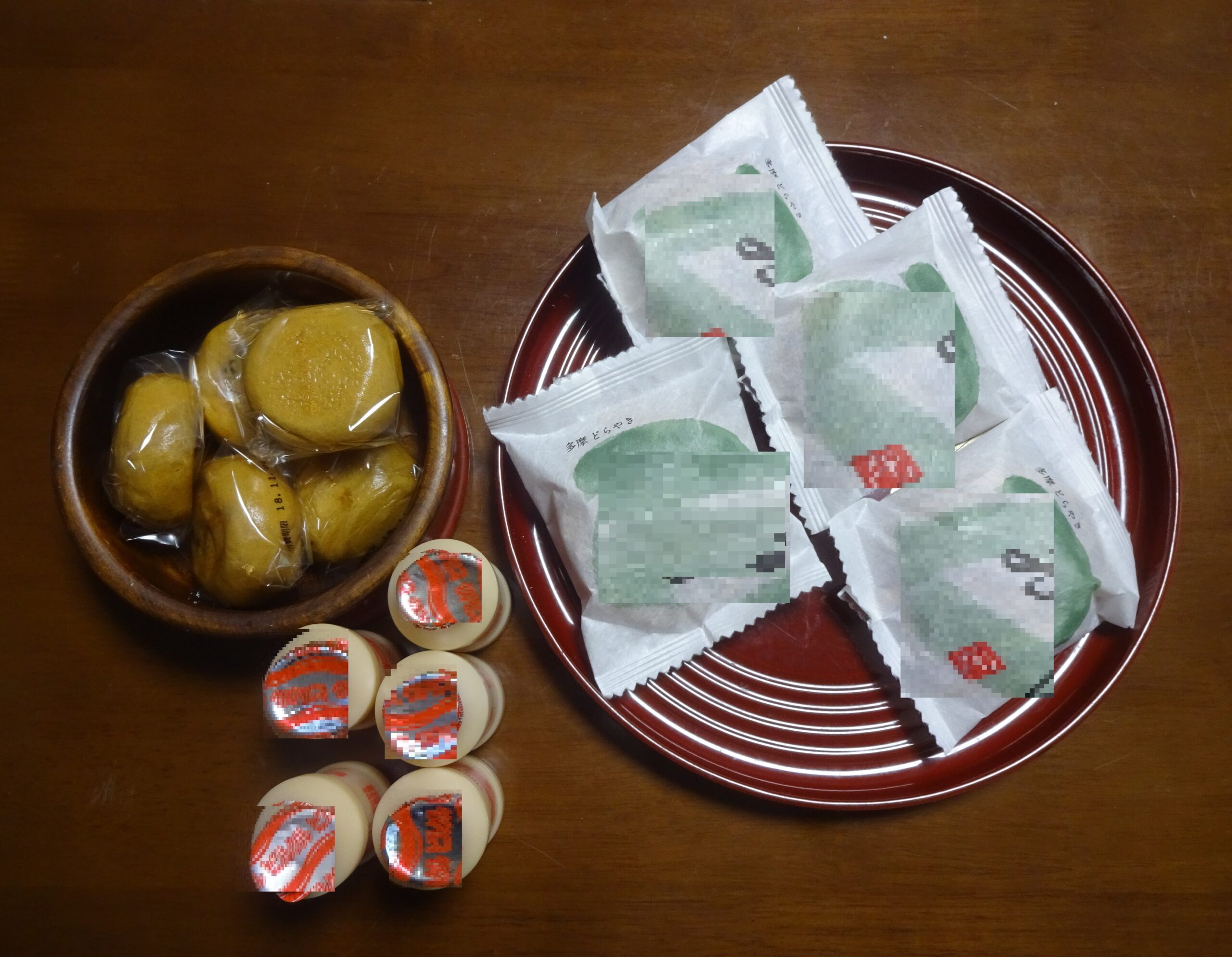 おもてなし(黒糖の薄皮饅頭まんじゅう、どら焼き そして 飲み物[乳酸菌飲料]など五人ごにん分)