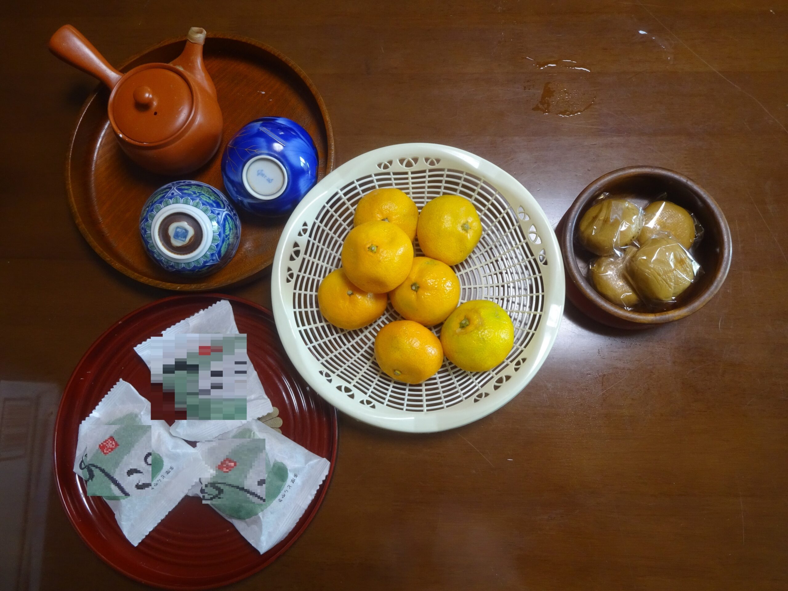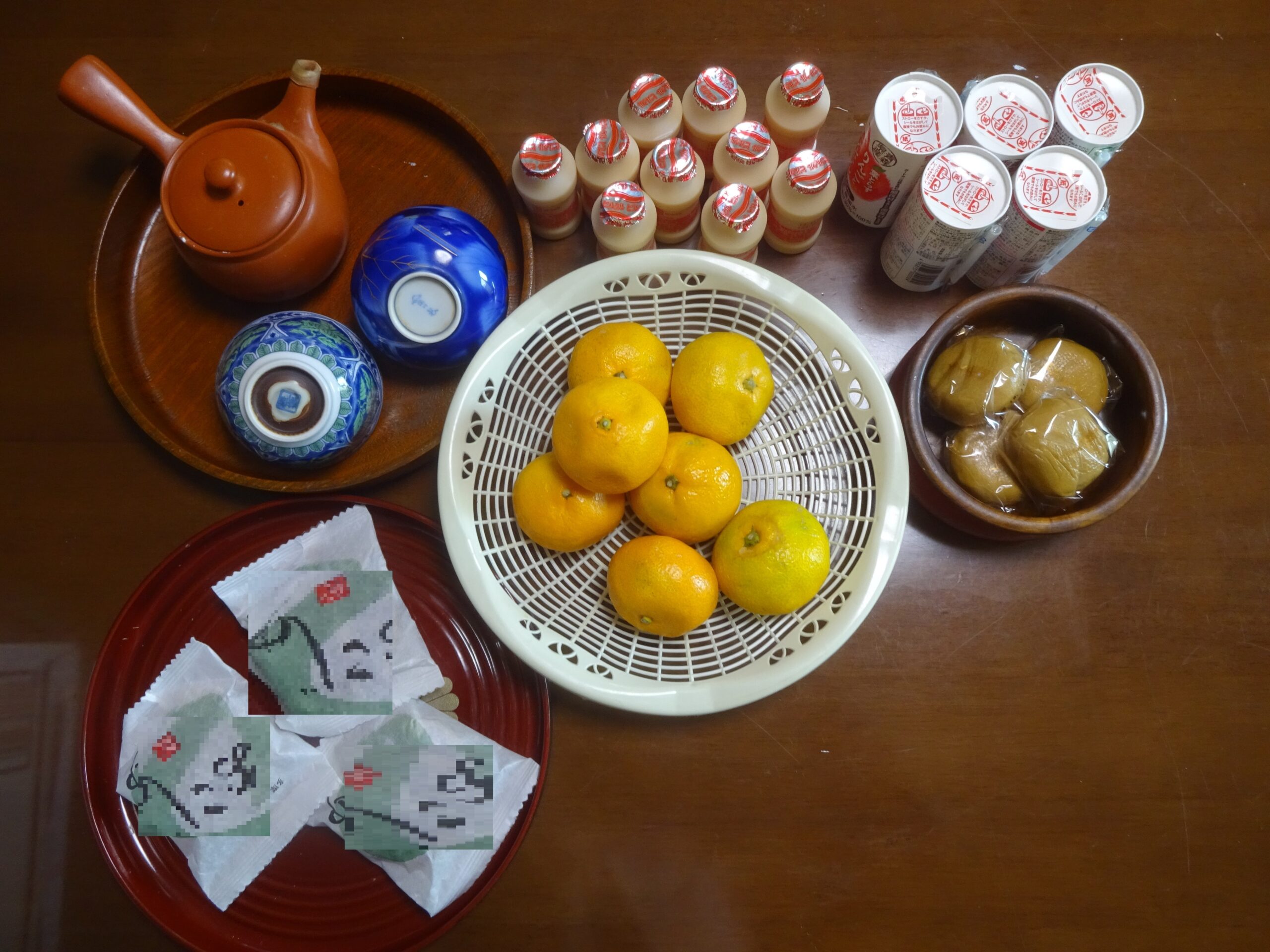 おもてなし(お茶、蜜柑 、黒糖の薄皮饅頭、どら焼き そして 飲み物[乳酸菌飲料]など五人分)