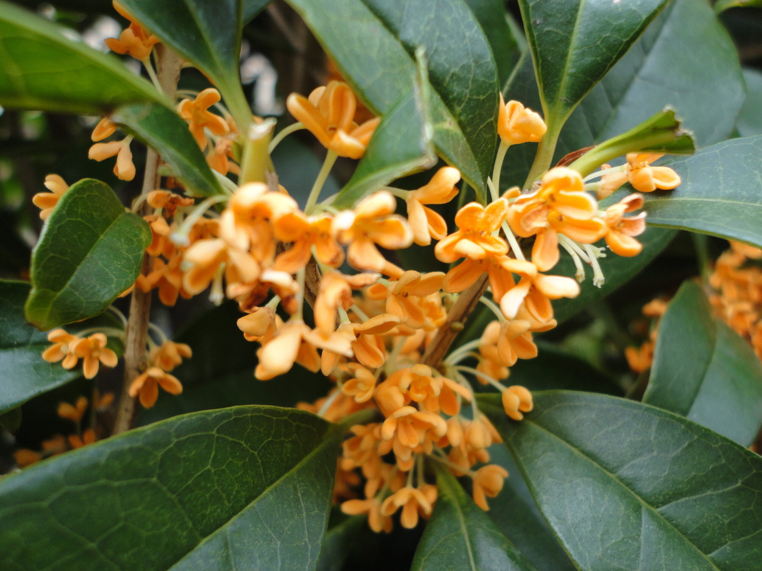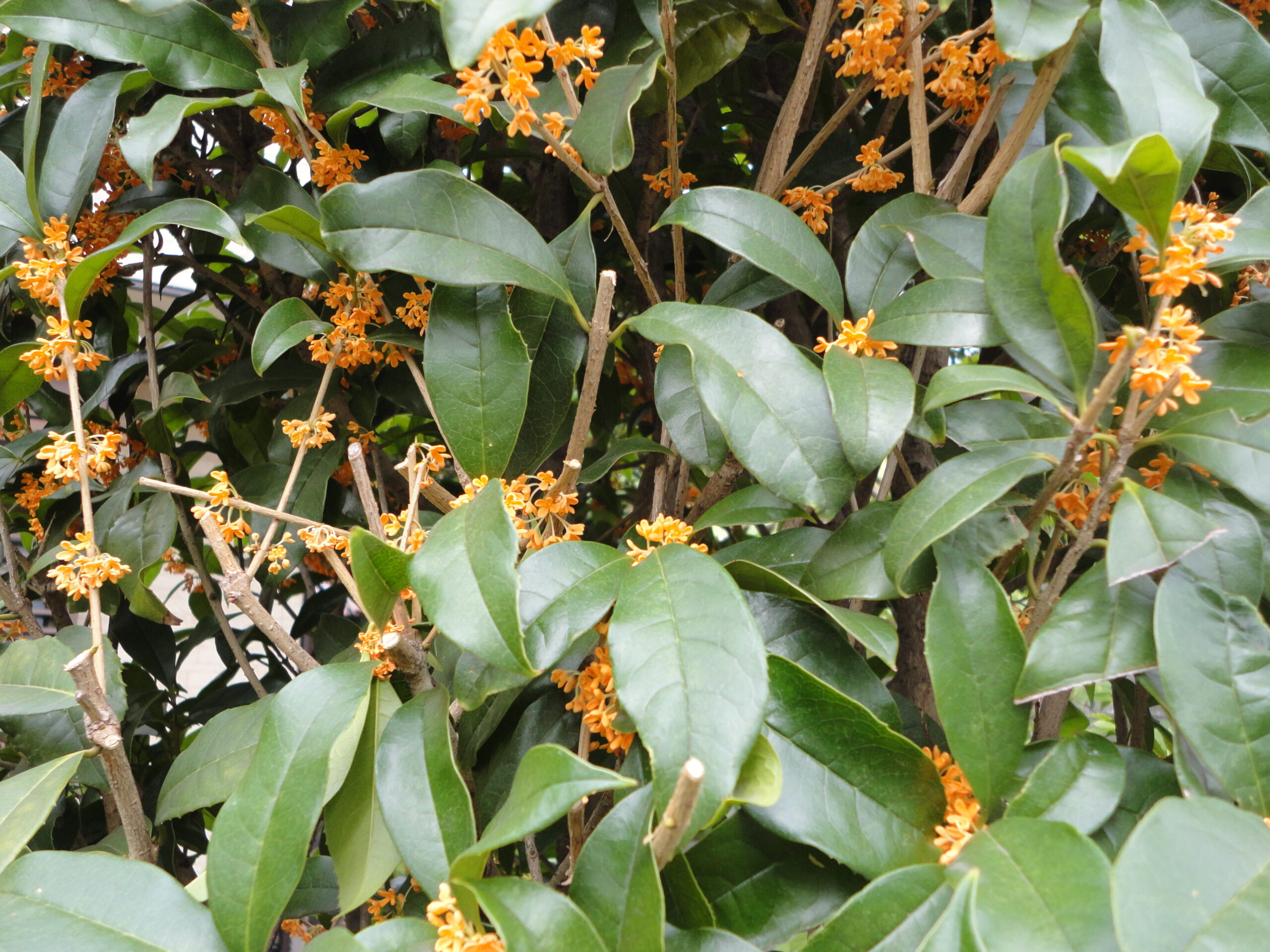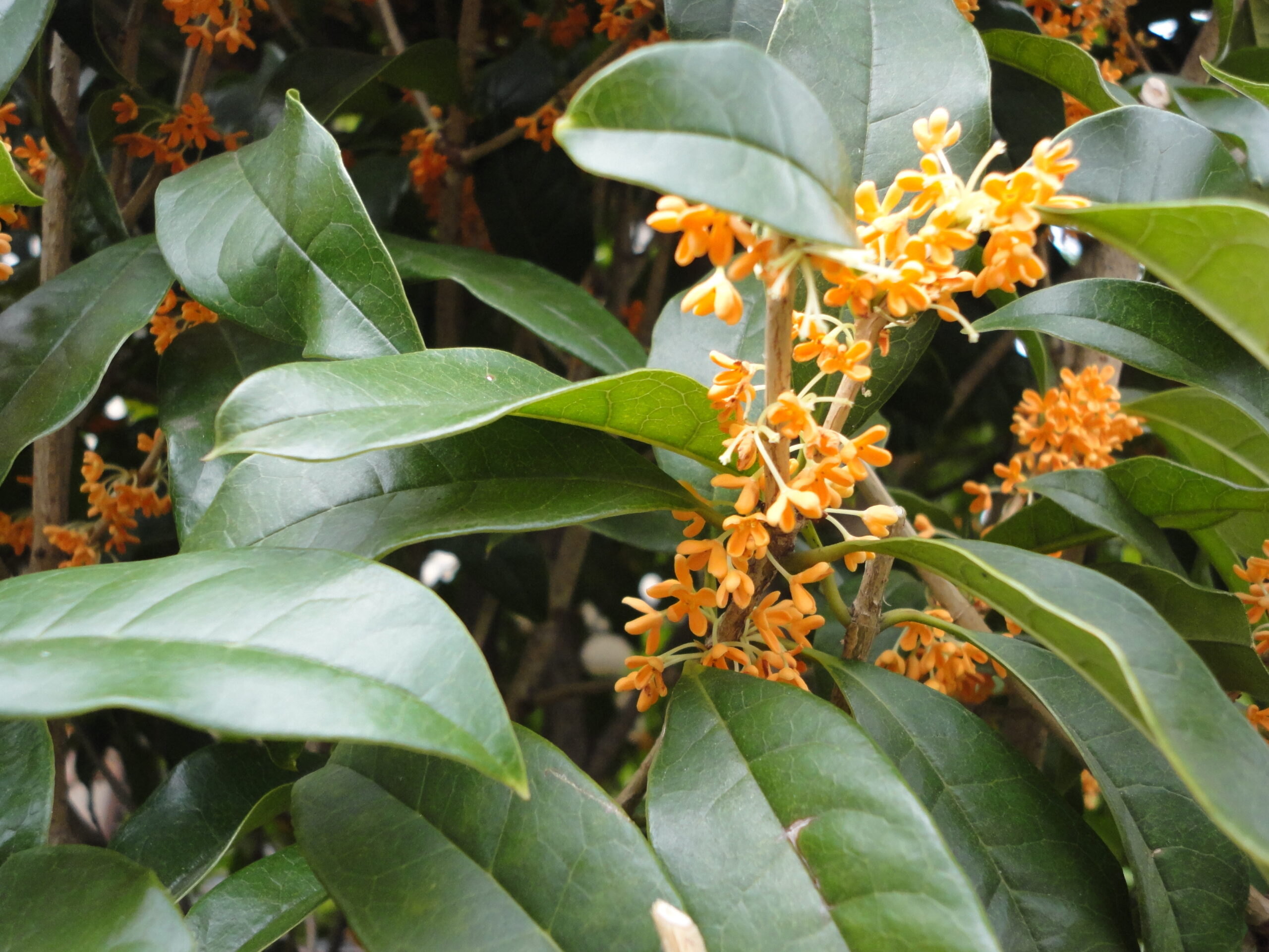 ところで、春に 花が咲き、芳香がある、代表的な木は 沈丁花ですが、秋のそれは、金木犀ですね。秋に 小さいオレンジ色の花を無数に咲かせます。秋に、自宅の庭で 撮影った、金木犀の花の写真を 下に掲載いたします。